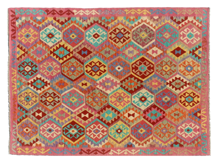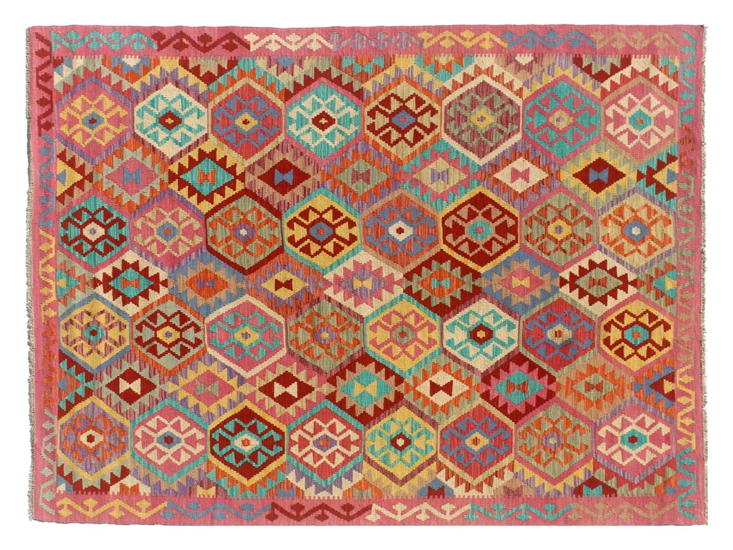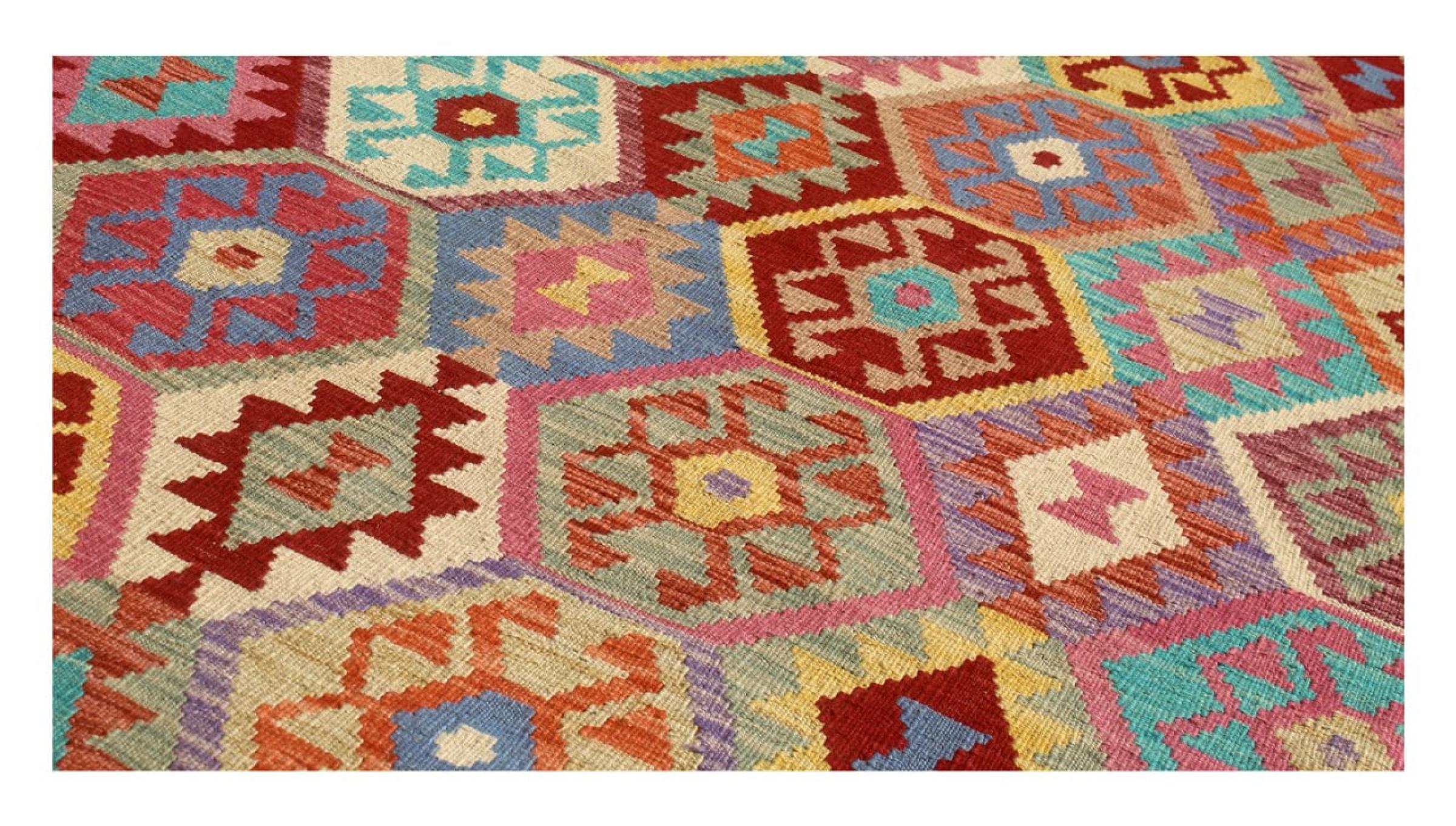 Questo kilim - afghano tessuto a mano è bello sia per i suoi colori e sia per il modello tipico. È stato tessuto a mano in Afghanistan con il 100% di lana. È anche robusto e durevole. Un vero e proprio profitto per voi e per la vostra casa.