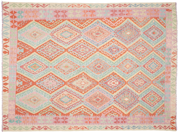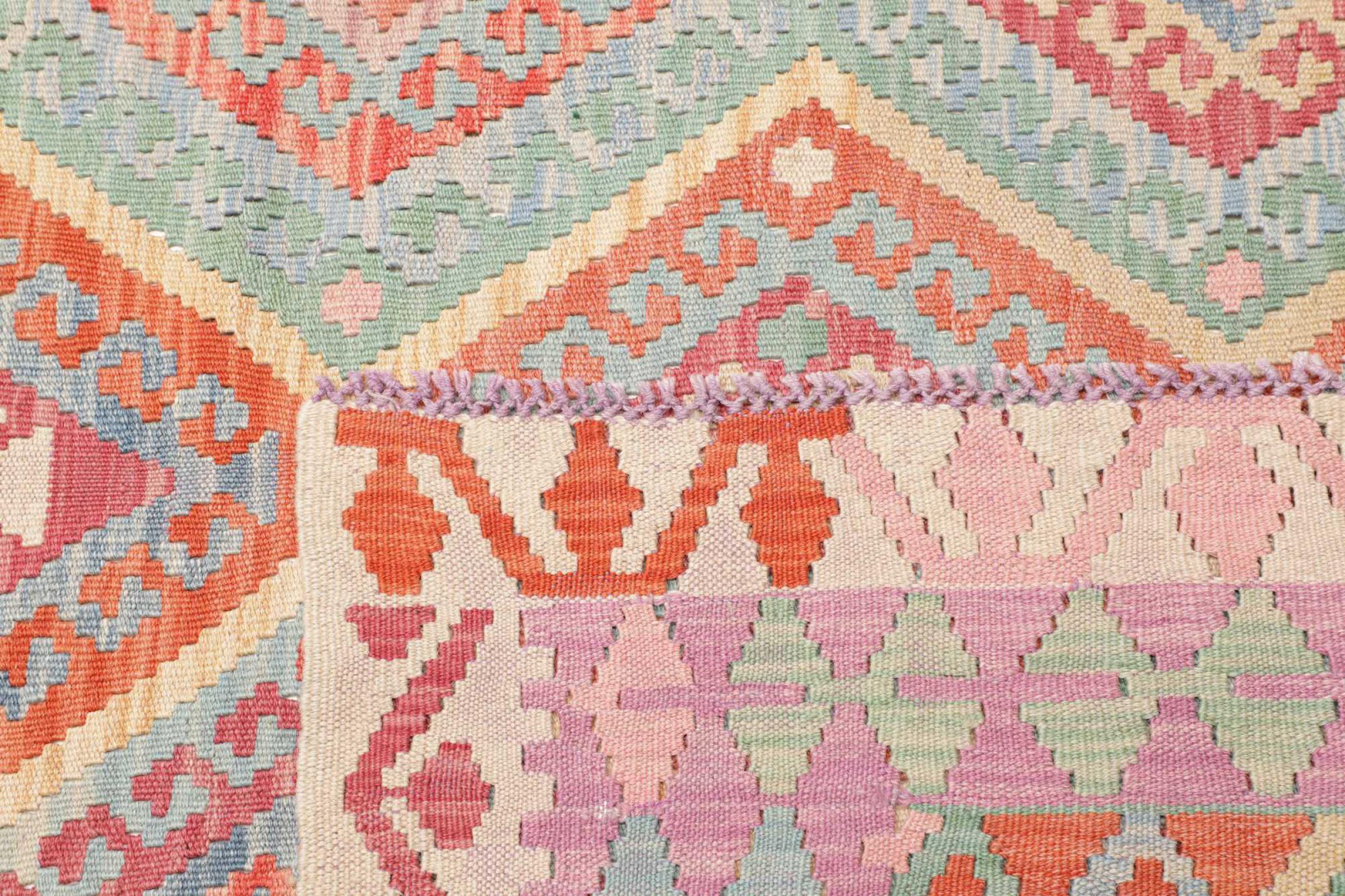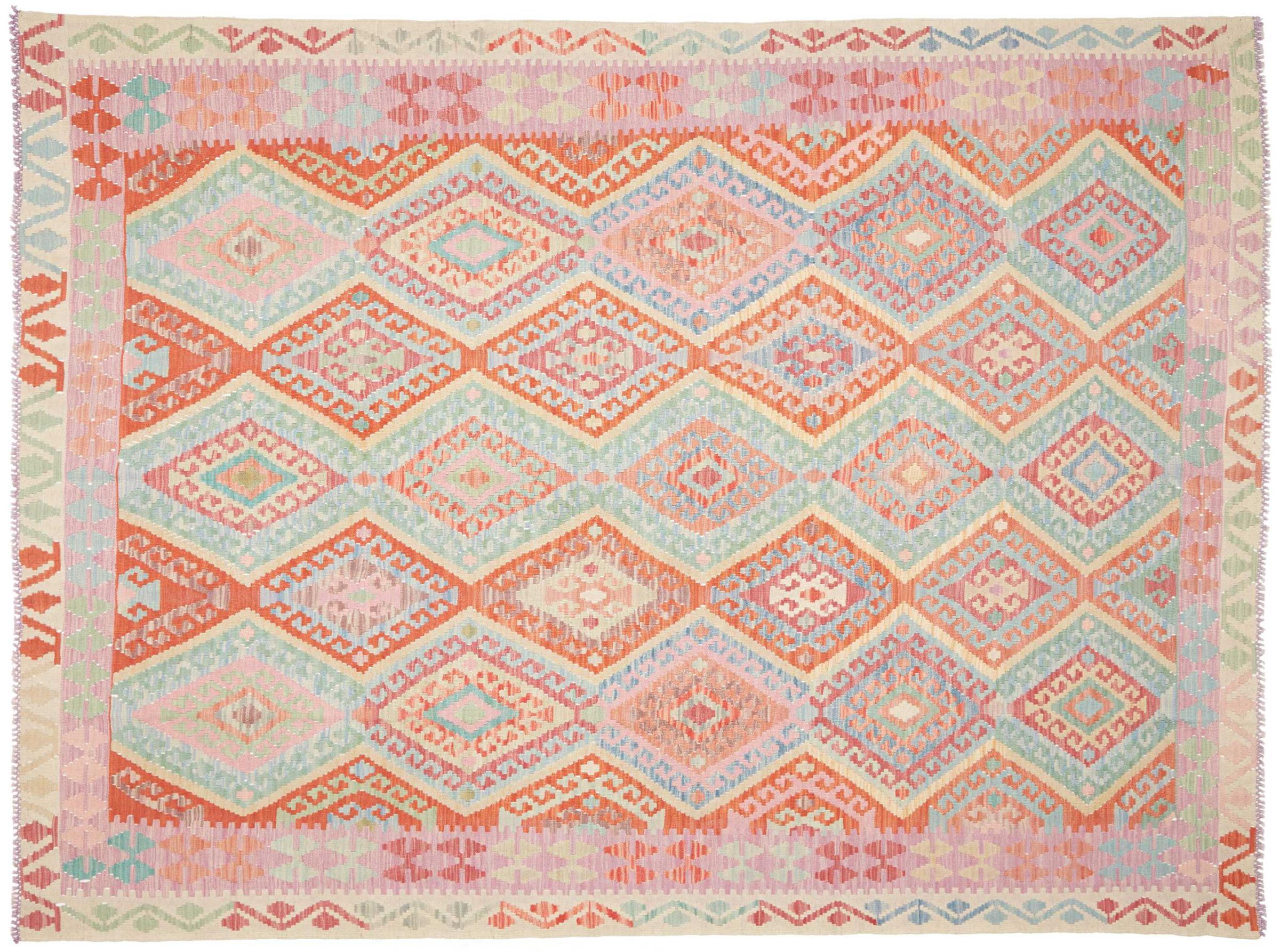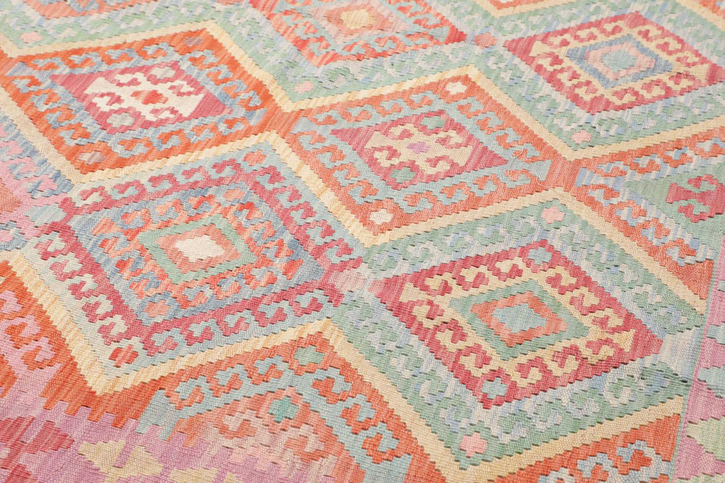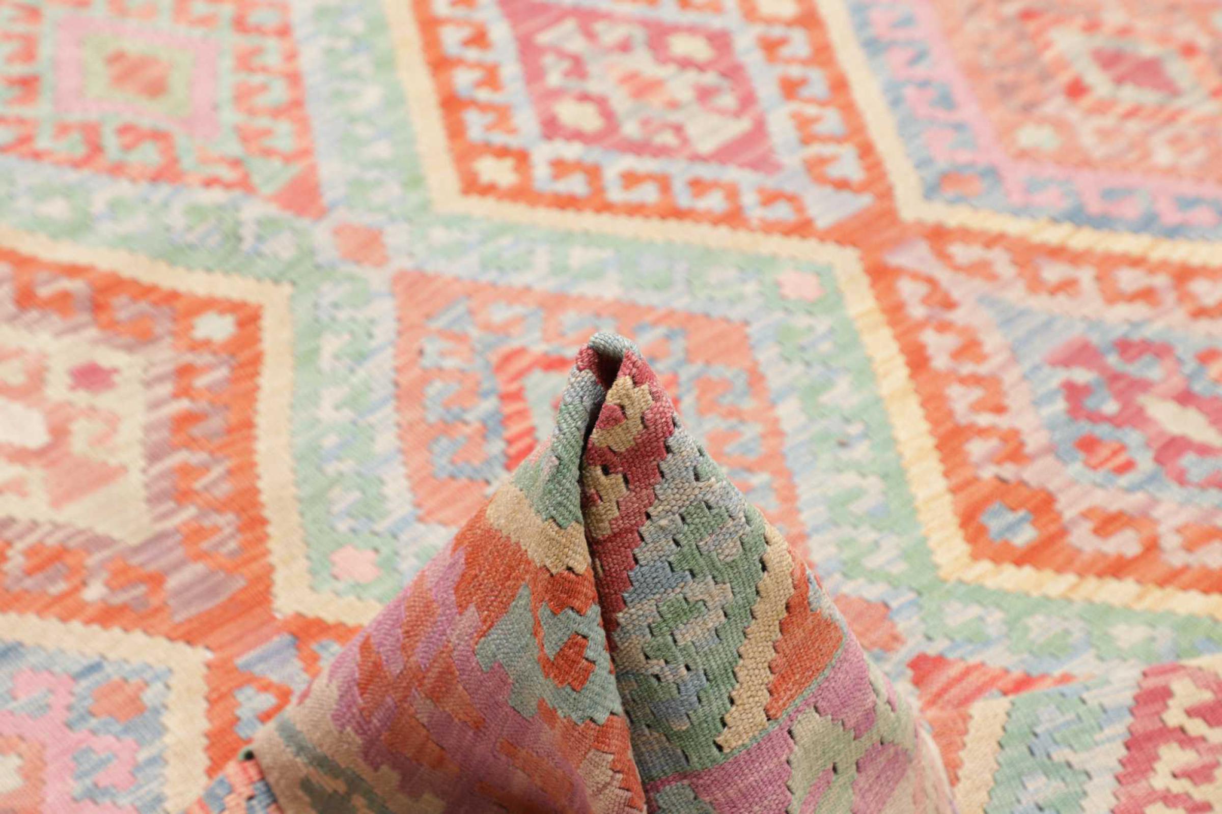 Questo kilim - afghano tessuto a mano è bello sia per i suoi colori e sia per il modello tipico. È stato tessuto a mano in Afghanistan con il 100% di lana. È anche robusto e durevole. Un vero e proprio profitto per voi e per la vostra casa.