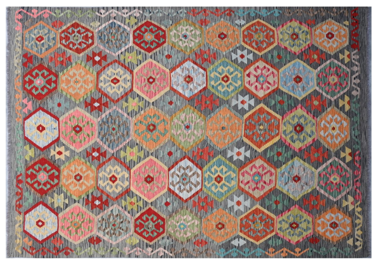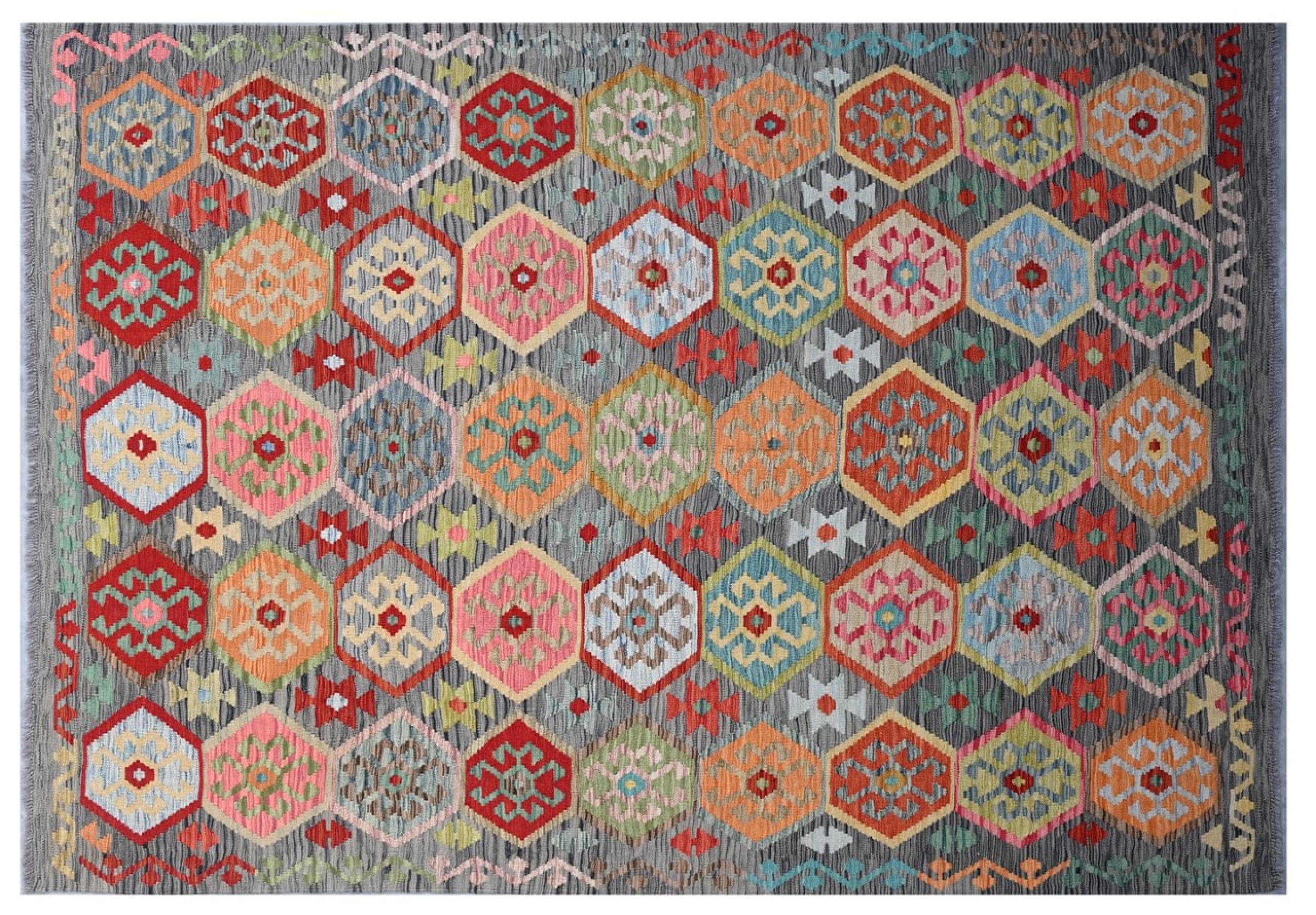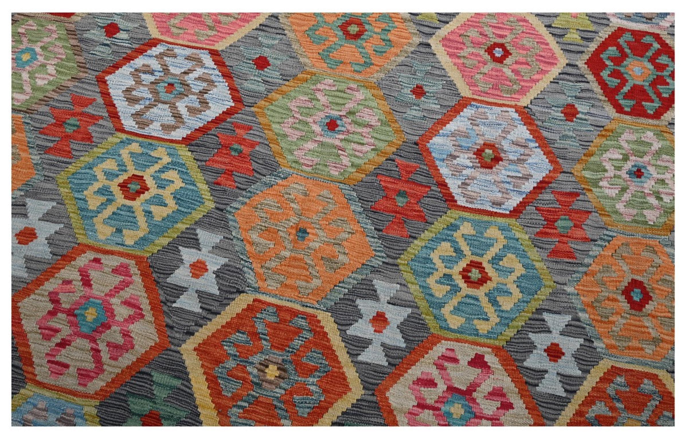 Questo kilim - afghano tessuto a mano è bello sia per i suoi colori e sia per il modello tipico. È stato tessuto a mano in Afghanistan con il 100% di lana. È anche robusto e durevole. Un vero e proprio profitto per voi e per la vostra casa.