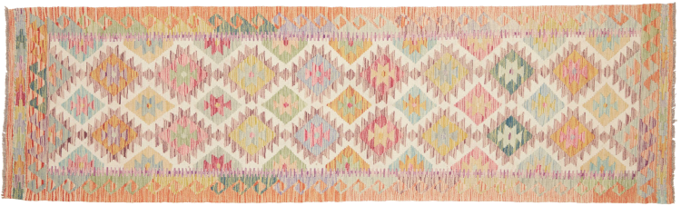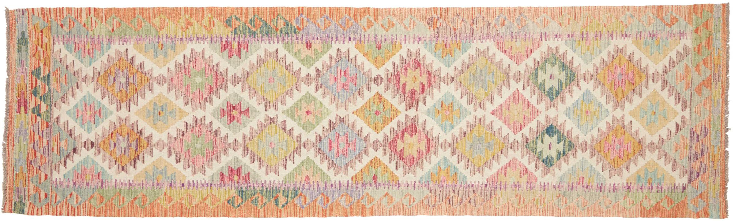 Questo kilim - afghano tessuto a mano è bello sia per i suoi colori e sia per il modello tipico. È stato tessuto a mano in Afghanistan con il 100% di lana. È anche robusto e durevole. Un vero e proprio profitto per voi e per la vostra casa.