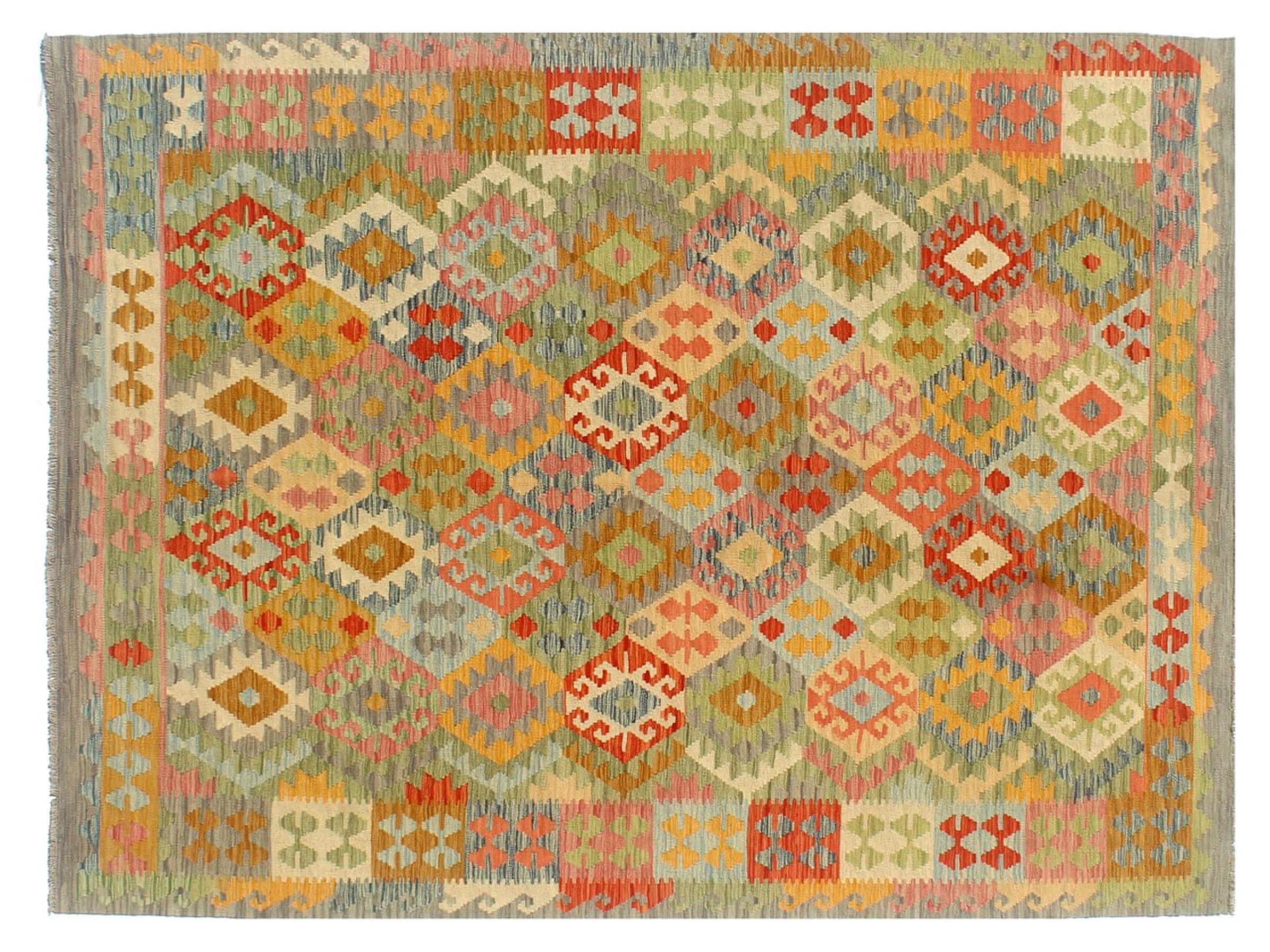 Questo kilim - afghano tessuto a mano è bello sia per i suoi colori e sia per il modello tipico. È stato tessuto a mano in Afghanistan con il 100% di lana. È anche robusto e durevole. Un vero e proprio profitto per voi e per la vostra casa.