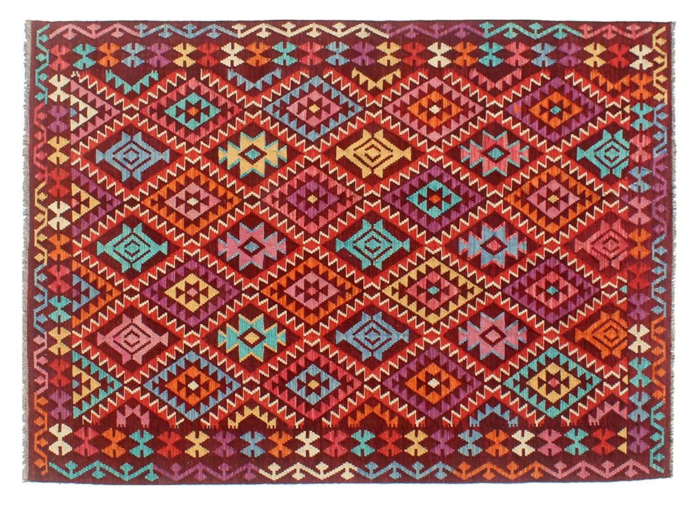 Questo kilim - afghano tessuto a mano è bello sia per i suoi colori e sia per il modello tipico. È stato tessuto a mano in Afghanistan con il 100% di lana. È anche robusto e durevole. Un vero e proprio profitto per voi e per la vostra casa.