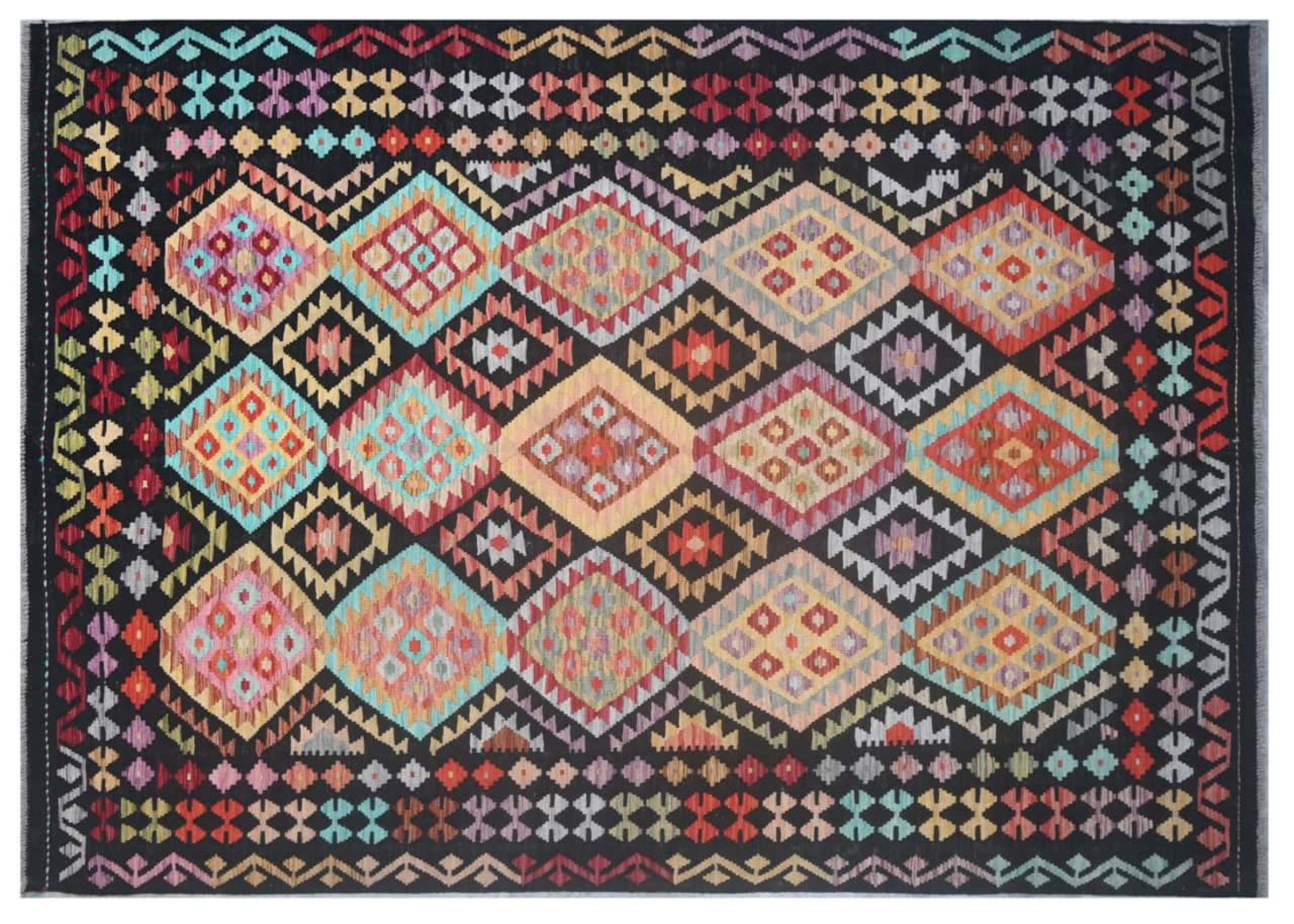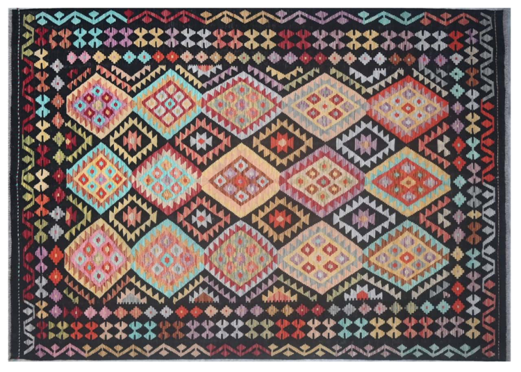 Questo kilim - afghano tessuto a mano è bello sia per i suoi colori e sia per il modello tipico. È stato tessuto a mano in Afghanistan con il 100% di lana. È anche robusto e durevole. Un vero e proprio profitto per voi e per la vostra casa.