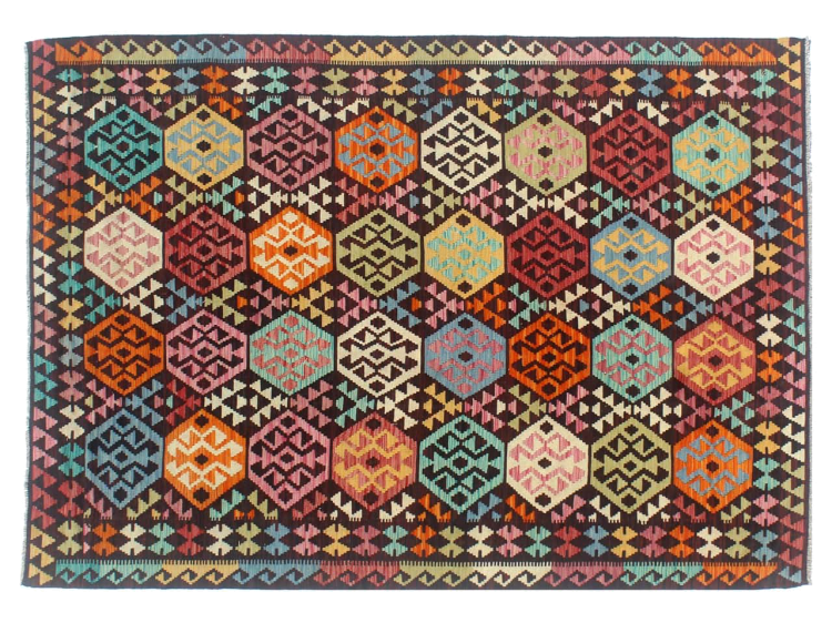 Questo kilim - afghano tessuto a mano è bello sia per i suoi colori e sia per il modello tipico. È stato tessuto a mano in Afghanistan con il 100% di lana. È anche robusto e durevole. Un vero e proprio profitto per voi e per la vostra casa.