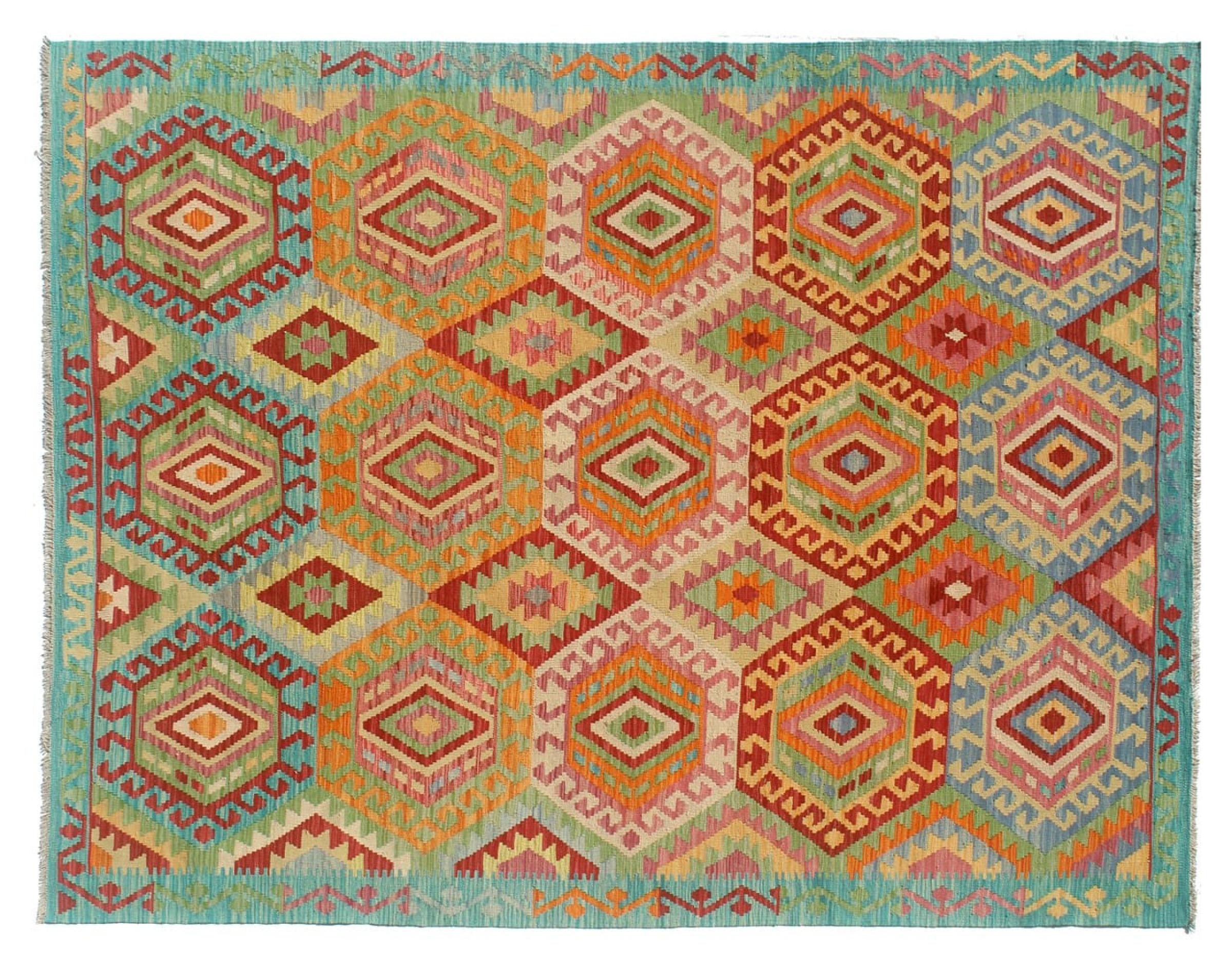 Questo kilim - afghano tessuto a mano è bello sia per i suoi colori e sia per il modello tipico. È stato tessuto a mano in Afghanistan con il 100% di lana. È anche robusto e durevole. Un vero e proprio profitto per voi e per la vostra casa.