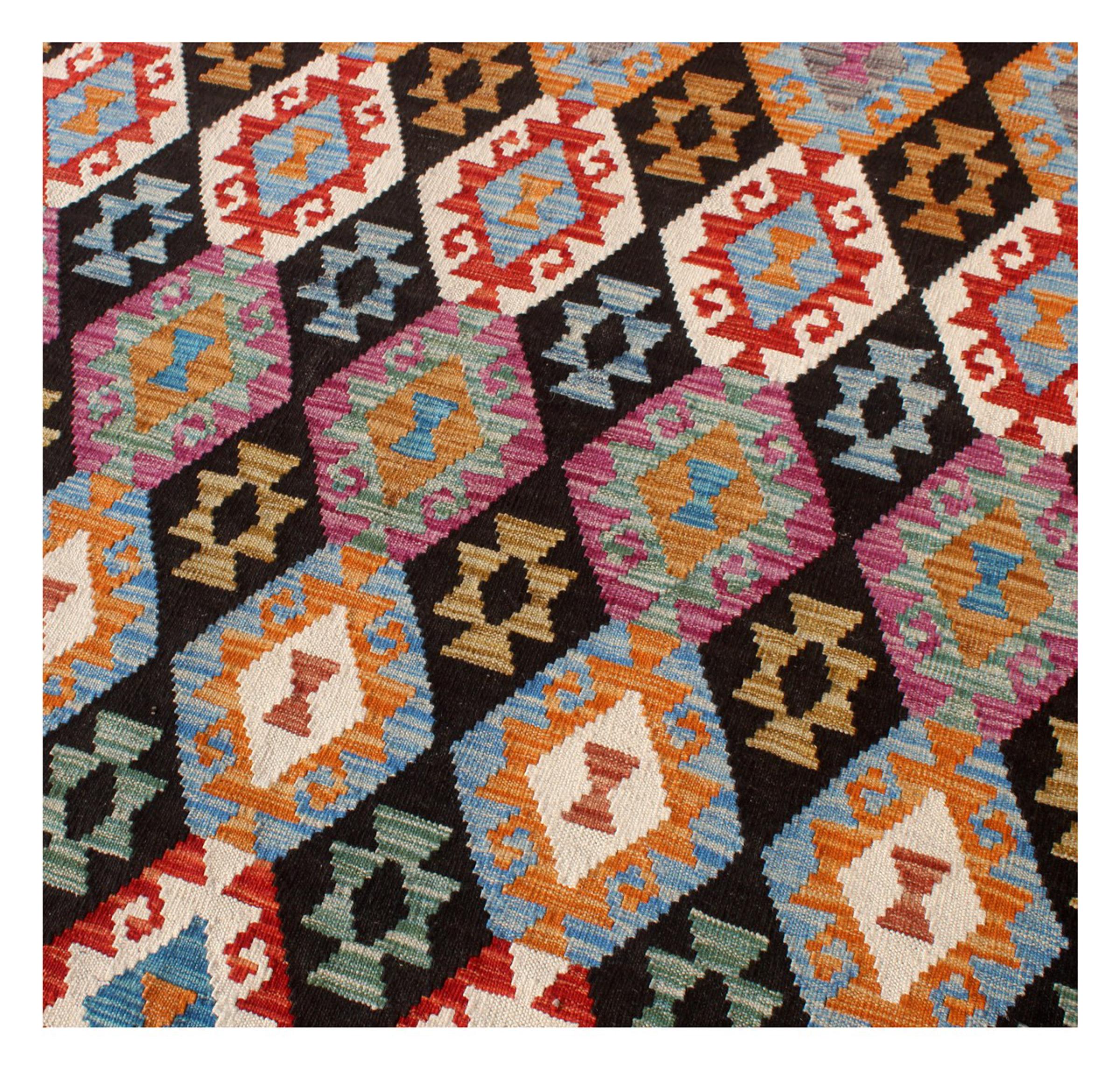 Questo kilim - afghano tessuto a mano è bello sia per i suoi colori e sia per il modello tipico. È stato tessuto a mano in Afghanistan con il 100% di lana. È anche robusto e durevole. Un vero e proprio profitto per voi e per la vostra casa.