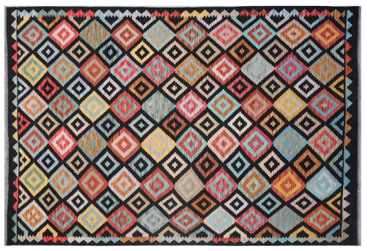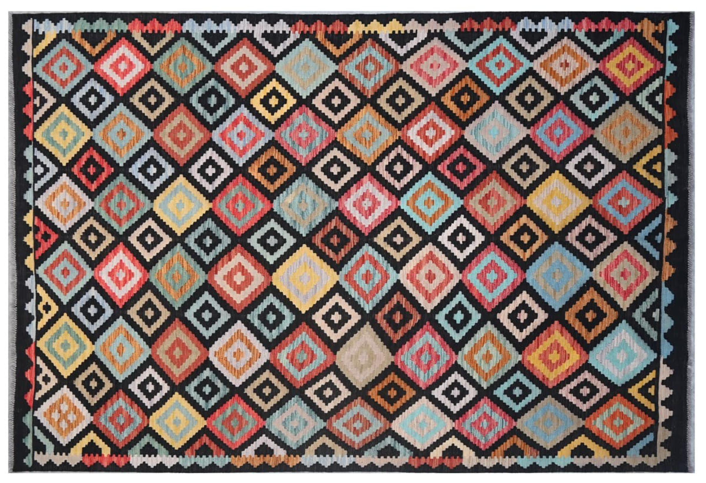 Questo kilim - afghano tessuto a mano è bello sia per i suoi colori e sia per il modello tipico. È stato tessuto a mano in Afghanistan con il 100% di lana. È anche robusto e durevole. Un vero e proprio profitto per voi e per la vostra casa.