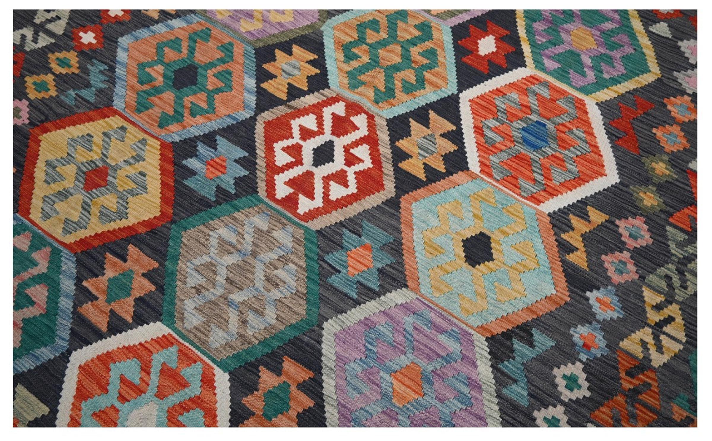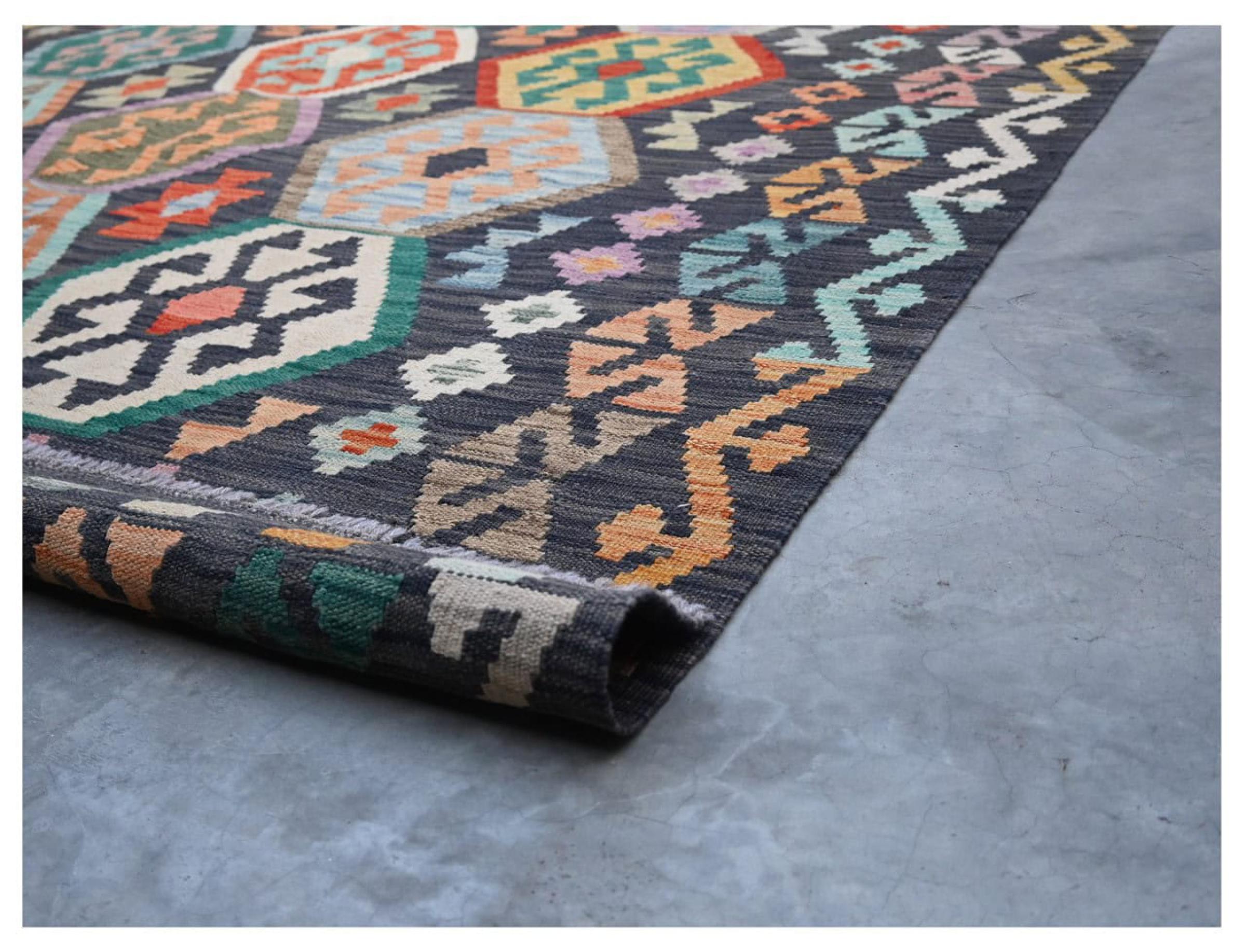 Questo kilim - afghano tessuto a mano è bello sia per i suoi colori e sia per il modello tipico. È stato tessuto a mano in Afghanistan con il 100% di lana. È anche robusto e durevole. Un vero e proprio profitto per voi e per la vostra casa.