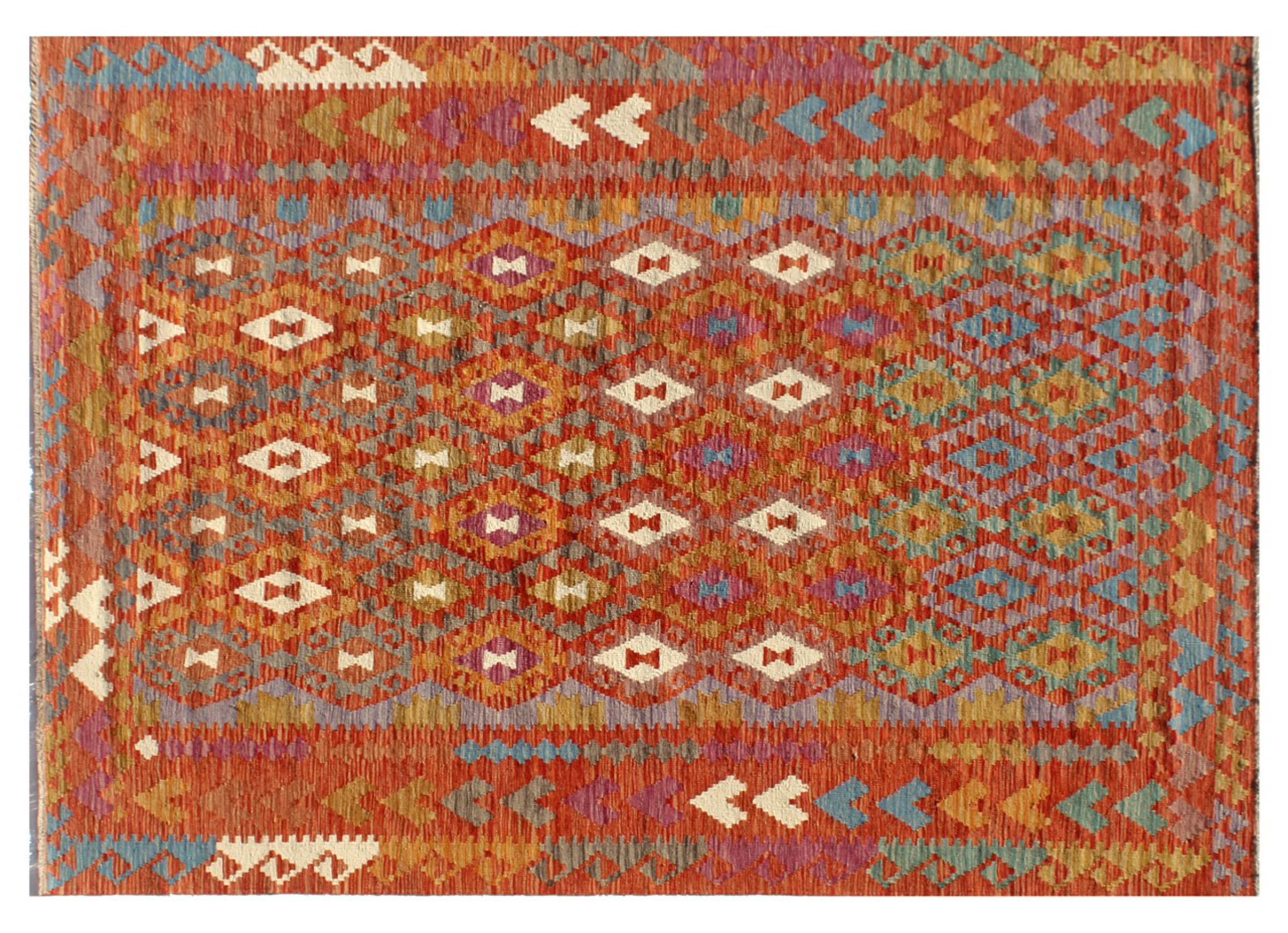 Questo kilim - afghano tessuto a mano è bello sia per i suoi colori e sia per il modello tipico. È stato tessuto a mano in Afghanistan con il 100% di lana. È anche robusto e durevole. Un vero e proprio profitto per voi e per la vostra casa.