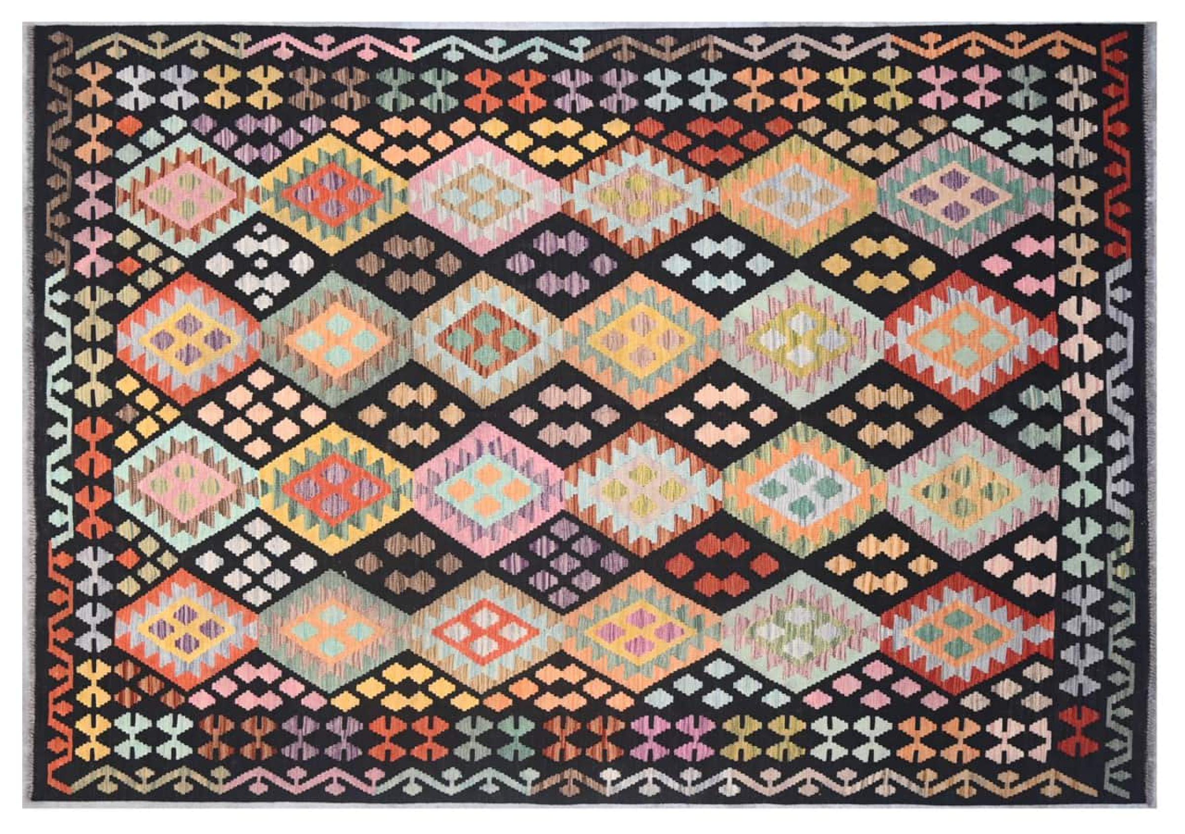 Questo kilim - afghano tessuto a mano è bello sia per i suoi colori e sia per il modello tipico. È stato tessuto a mano in Afghanistan con il 100% di lana. È anche robusto e durevole. Un vero e proprio profitto per voi e per la vostra casa.