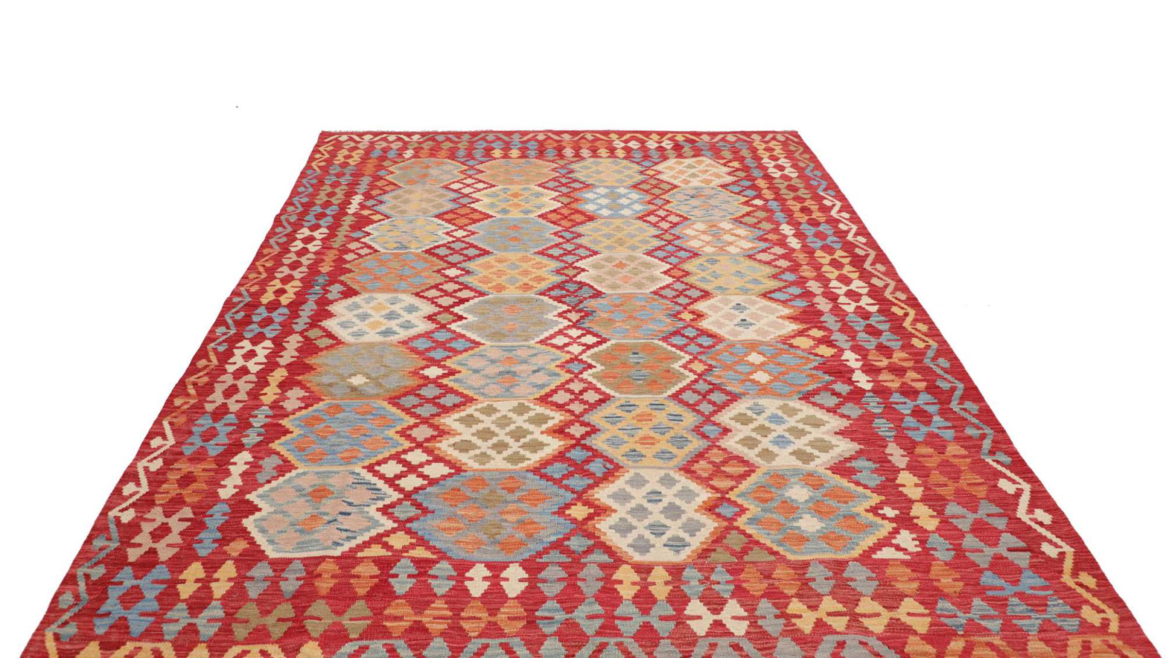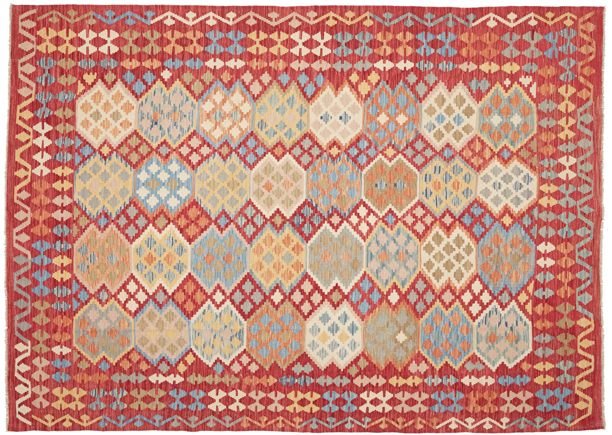 Questo kilim - afghano tessuto a mano è bello sia per i suoi colori e sia per il modello tipico. È stato tessuto a mano in Afghanistan con il 100% di lana. È anche robusto e durevole. Un vero e proprio profitto per voi e per la vostra casa.