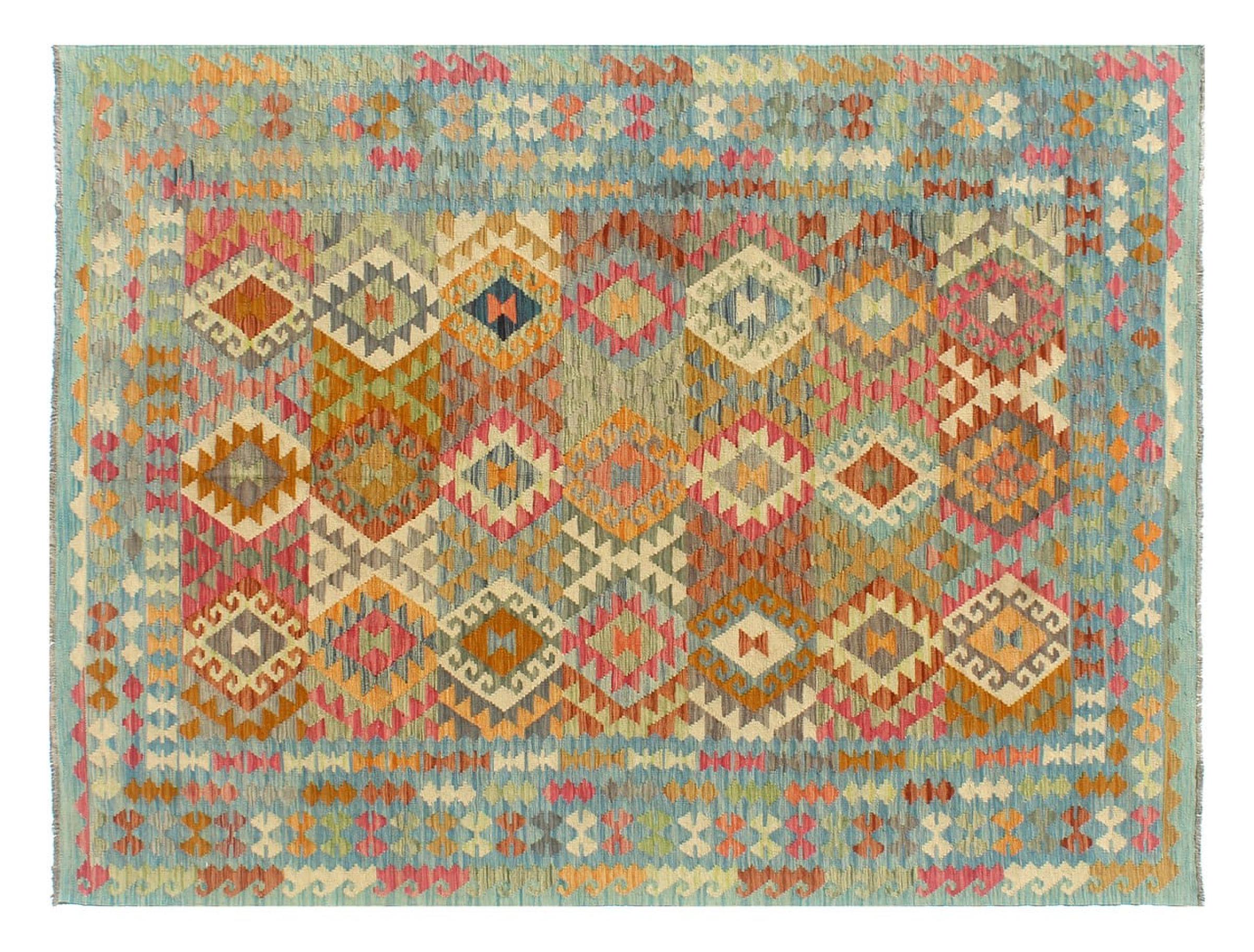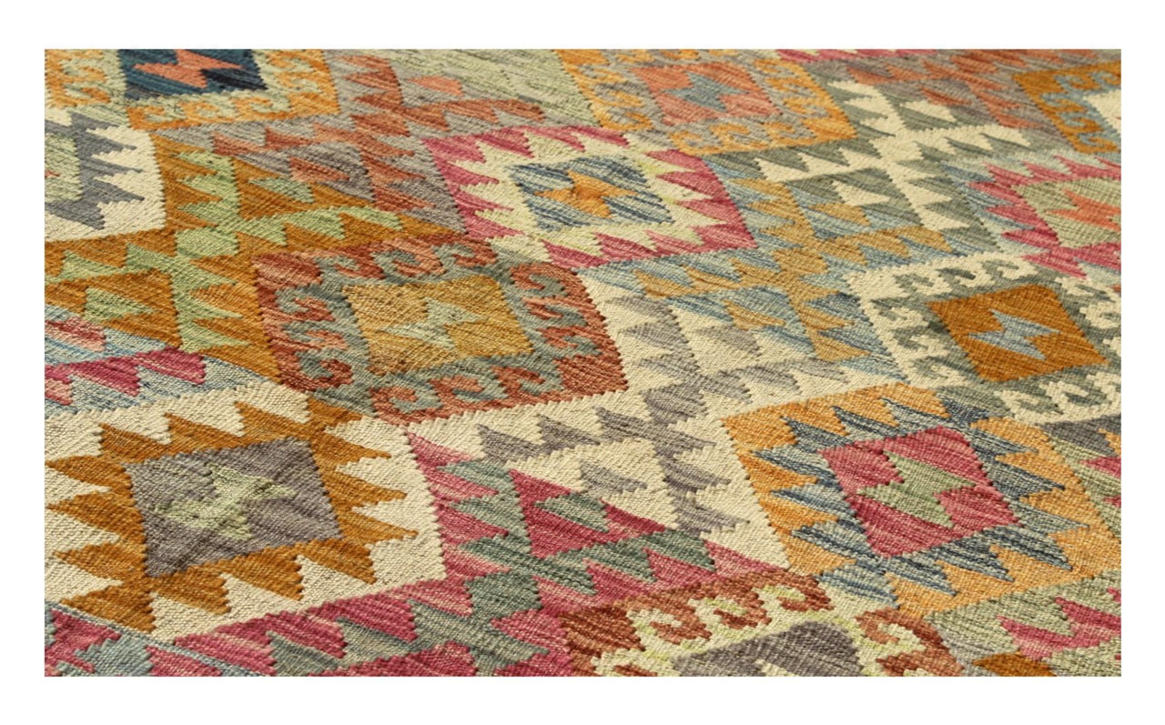Questo kilim - afghano tessuto a mano è bello sia per i suoi colori e sia per il modello tipico. È stato tessuto a mano in Afghanistan con il 100% di lana. È anche robusto e durevole. Un vero e proprio profitto per voi e per la vostra casa.