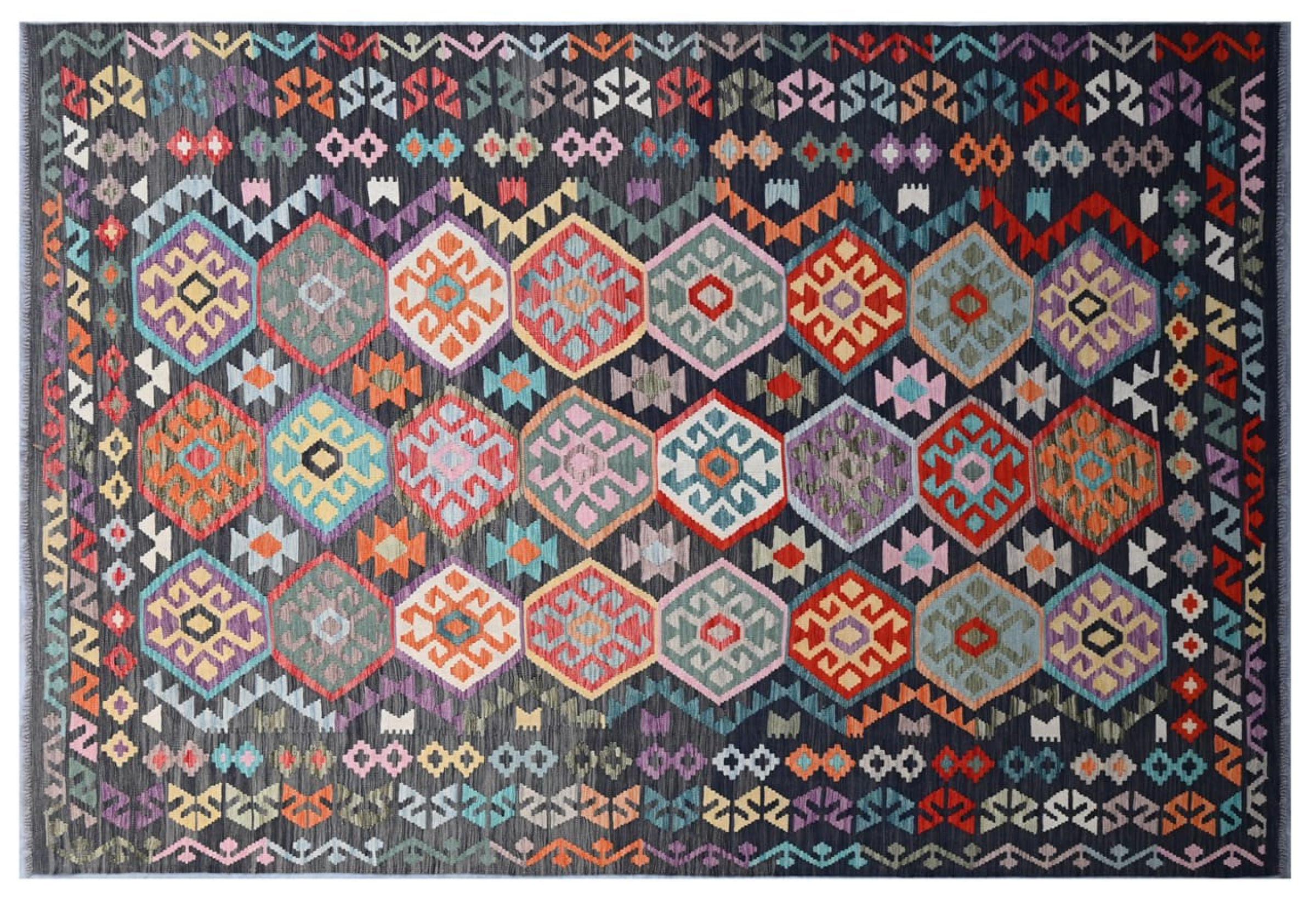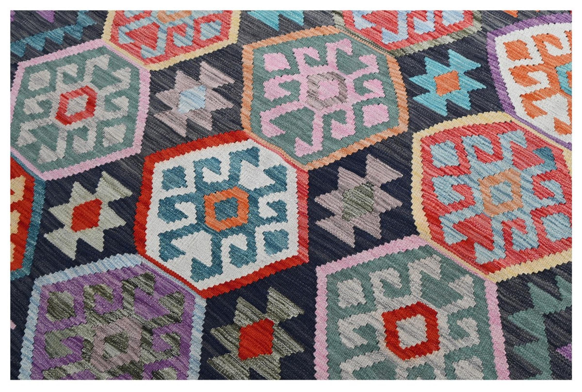 Questo kilim - afghano tessuto a mano è bello sia per i suoi colori e sia per il modello tipico. È stato tessuto a mano in Afghanistan con il 100% di lana. È anche robusto e durevole. Un vero e proprio profitto per voi e per la vostra casa.