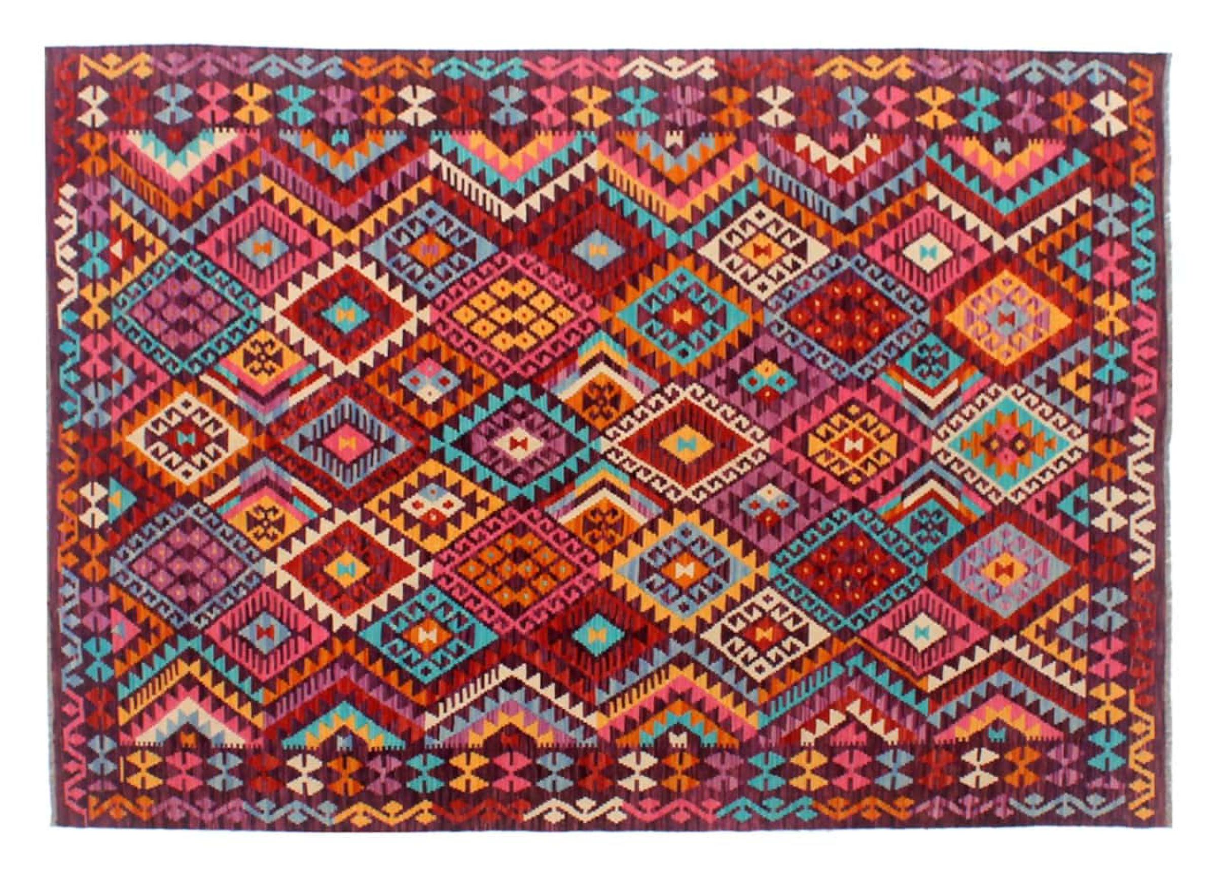 Questo kilim - afghano tessuto a mano è bello sia per i suoi colori e sia per il modello tipico. È stato tessuto a mano in Afghanistan con il 100% di lana. È anche robusto e durevole. Un vero e proprio profitto per voi e per la vostra casa.