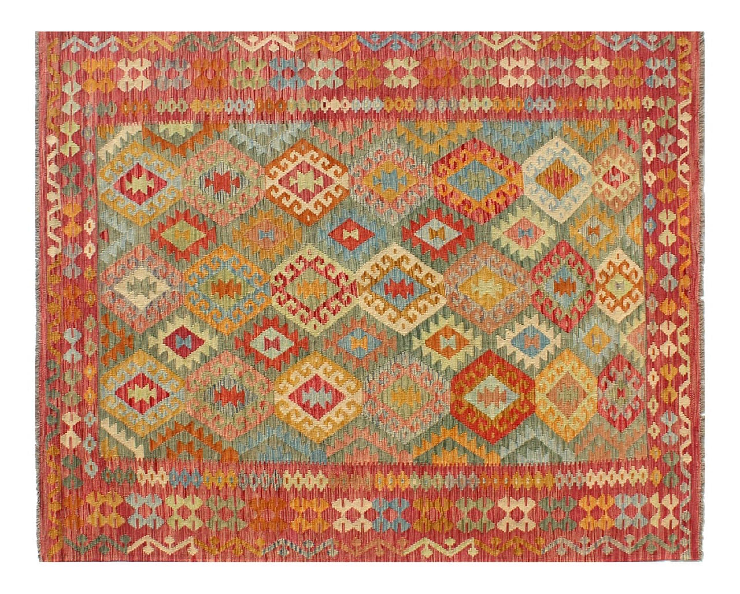 Questo kilim - afghano tessuto a mano è bello sia per i suoi colori e sia per il modello tipico. È stato tessuto a mano in Afghanistan con il 100% di lana. È anche robusto e durevole. Un vero e proprio profitto per voi e per la vostra casa.