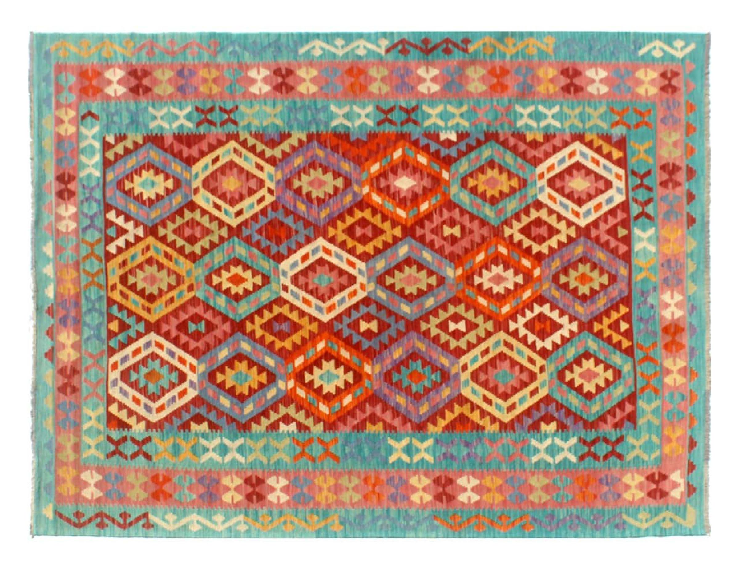 Questo kilim - afghano tessuto a mano è bello sia per i suoi colori e sia per il modello tipico. È stato tessuto a mano in Afghanistan con il 100% di lana. È anche robusto e durevole. Un vero e proprio profitto per voi e per la vostra casa.