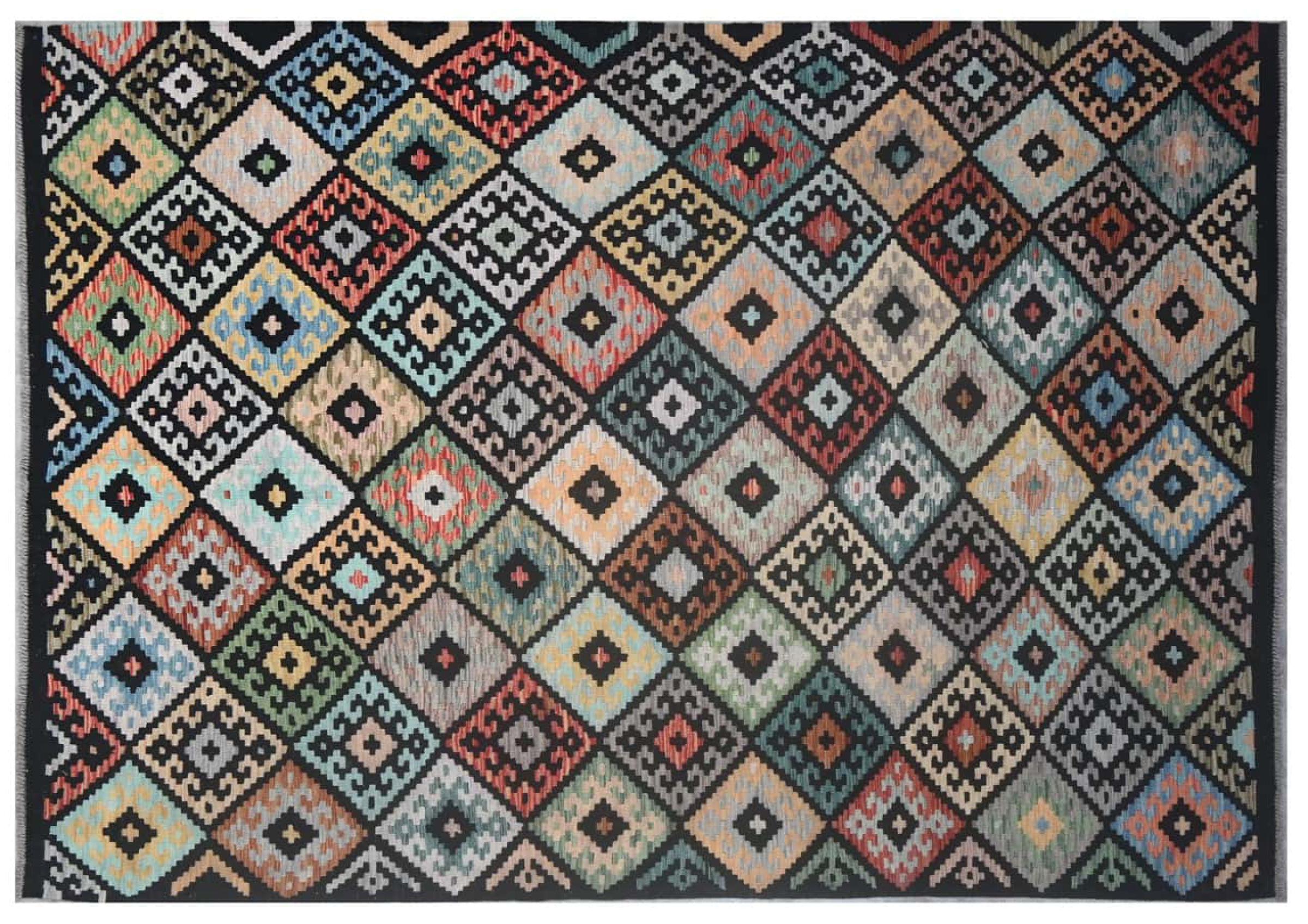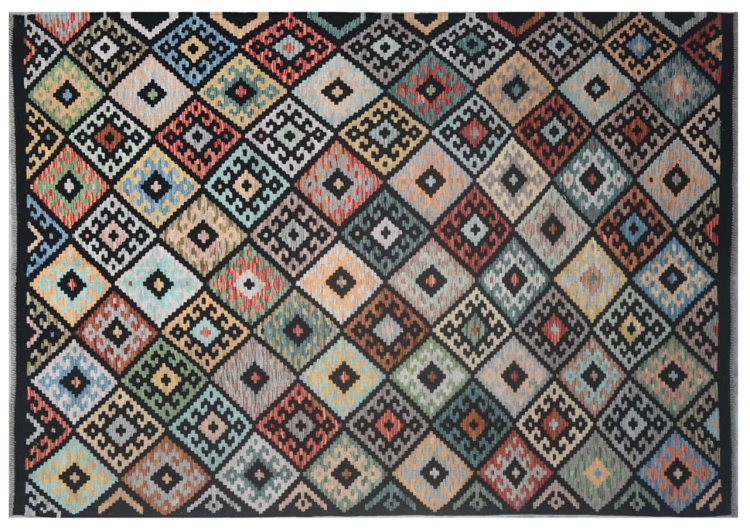 Questo kilim - afghano tessuto a mano è bello sia per i suoi colori e sia per il modello tipico. È stato tessuto a mano in Afghanistan con il 100% di lana. È anche robusto e durevole. Un vero e proprio profitto per voi e per la vostra casa.