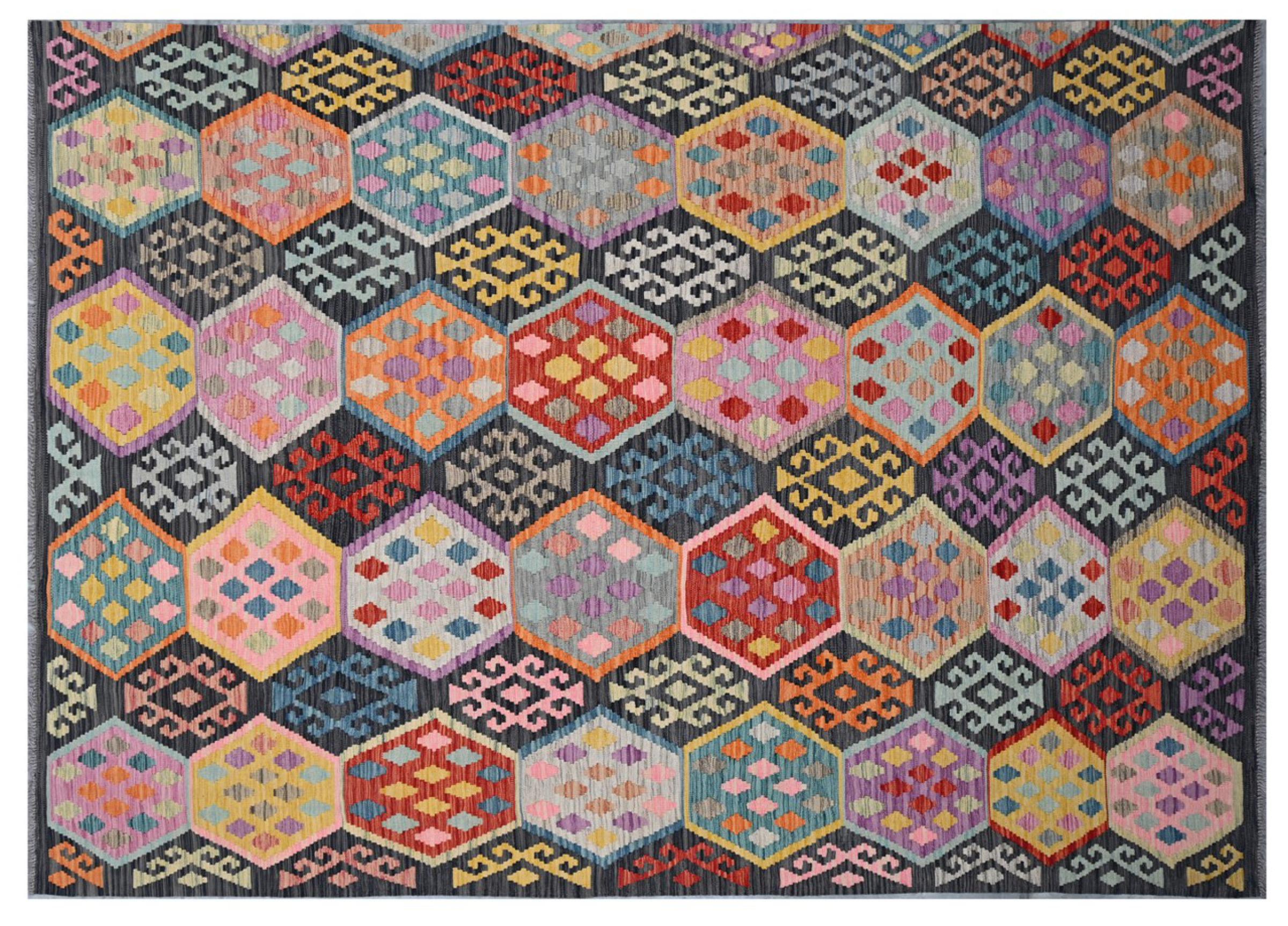 Questo kilim - afghano tessuto a mano è bello sia per i suoi colori e sia per il modello tipico. È stato tessuto a mano in Afghanistan con il 100% di lana. È anche robusto e durevole. Un vero e proprio profitto per voi e per la vostra casa.