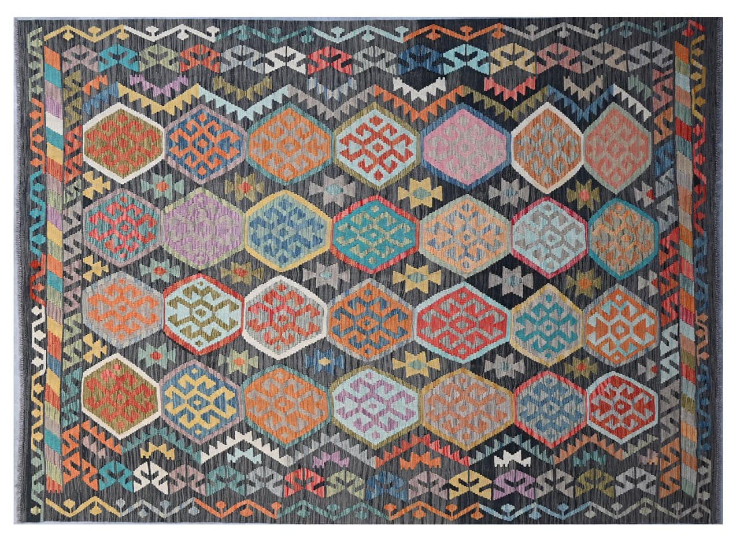 Questo kilim - afghano tessuto a mano è bello sia per i suoi colori e sia per il modello tipico. È stato tessuto a mano in Afghanistan con il 100% di lana. È anche robusto e durevole. Un vero e proprio profitto per voi e per la vostra casa.