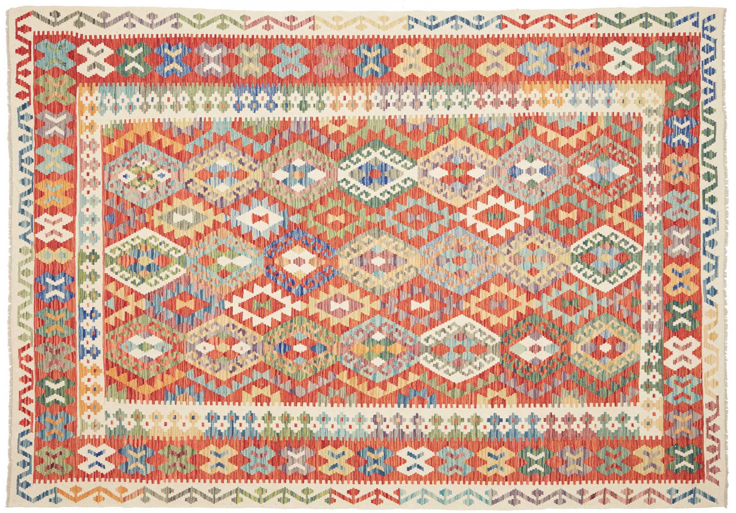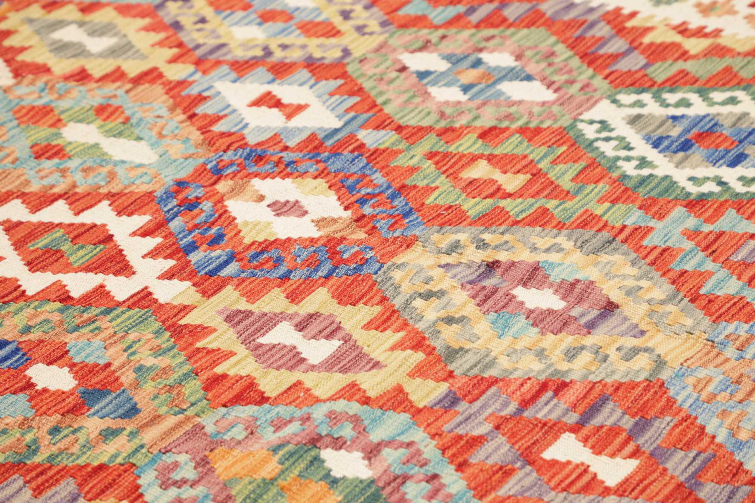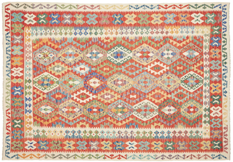 Questo kilim - afghano tessuto a mano è bello sia per i suoi colori e sia per il modello tipico. È stato tessuto a mano in Afghanistan con il 100% di lana. È anche robusto e durevole. Un vero e proprio profitto per voi e per la vostra casa.