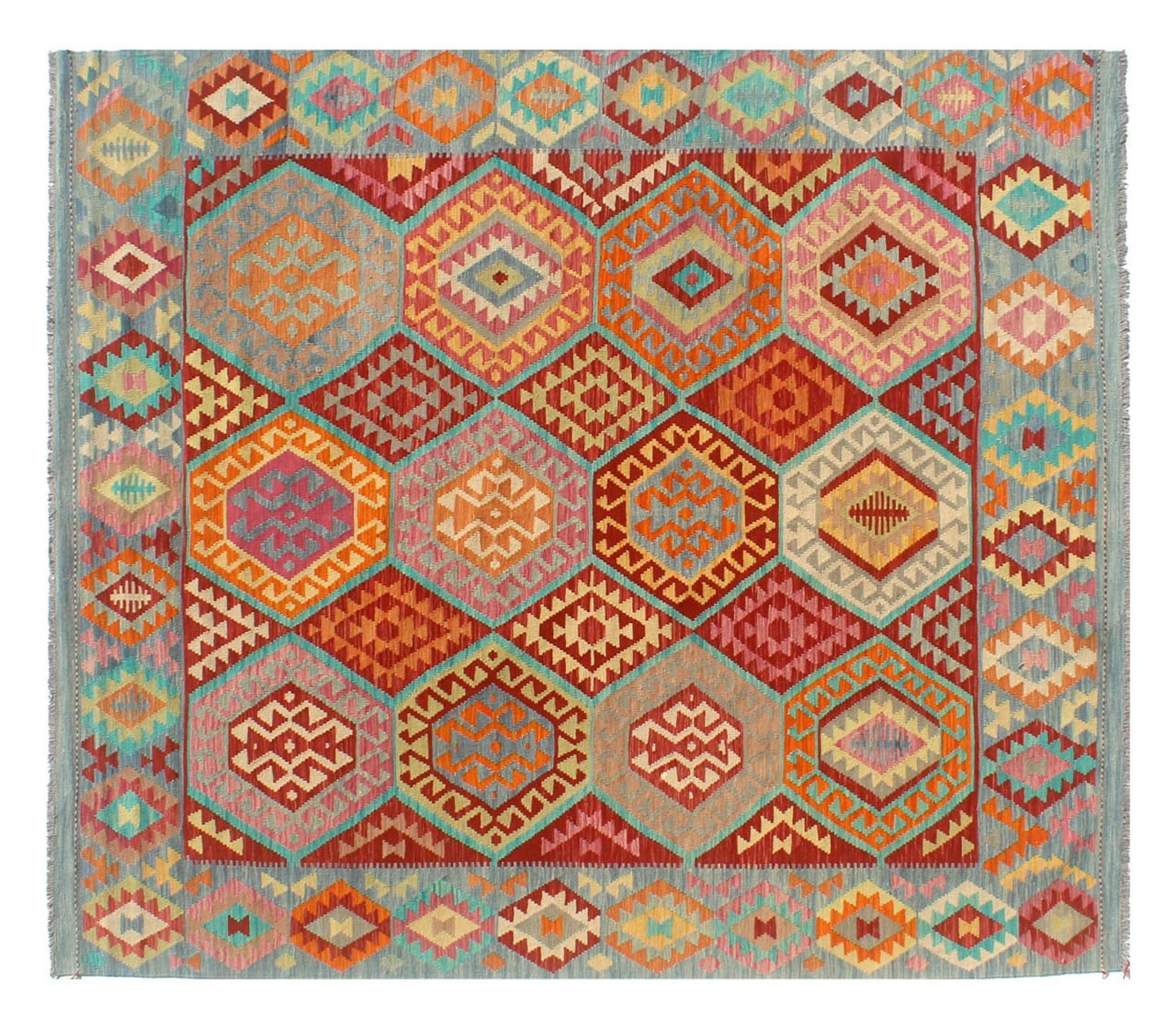 Questo kilim - afghano tessuto a mano è bello sia per i suoi colori e sia per il modello tipico. È stato tessuto a mano in Afghanistan con il 100% di lana. È anche robusto e durevole. Un vero e proprio profitto per voi e per la vostra casa.