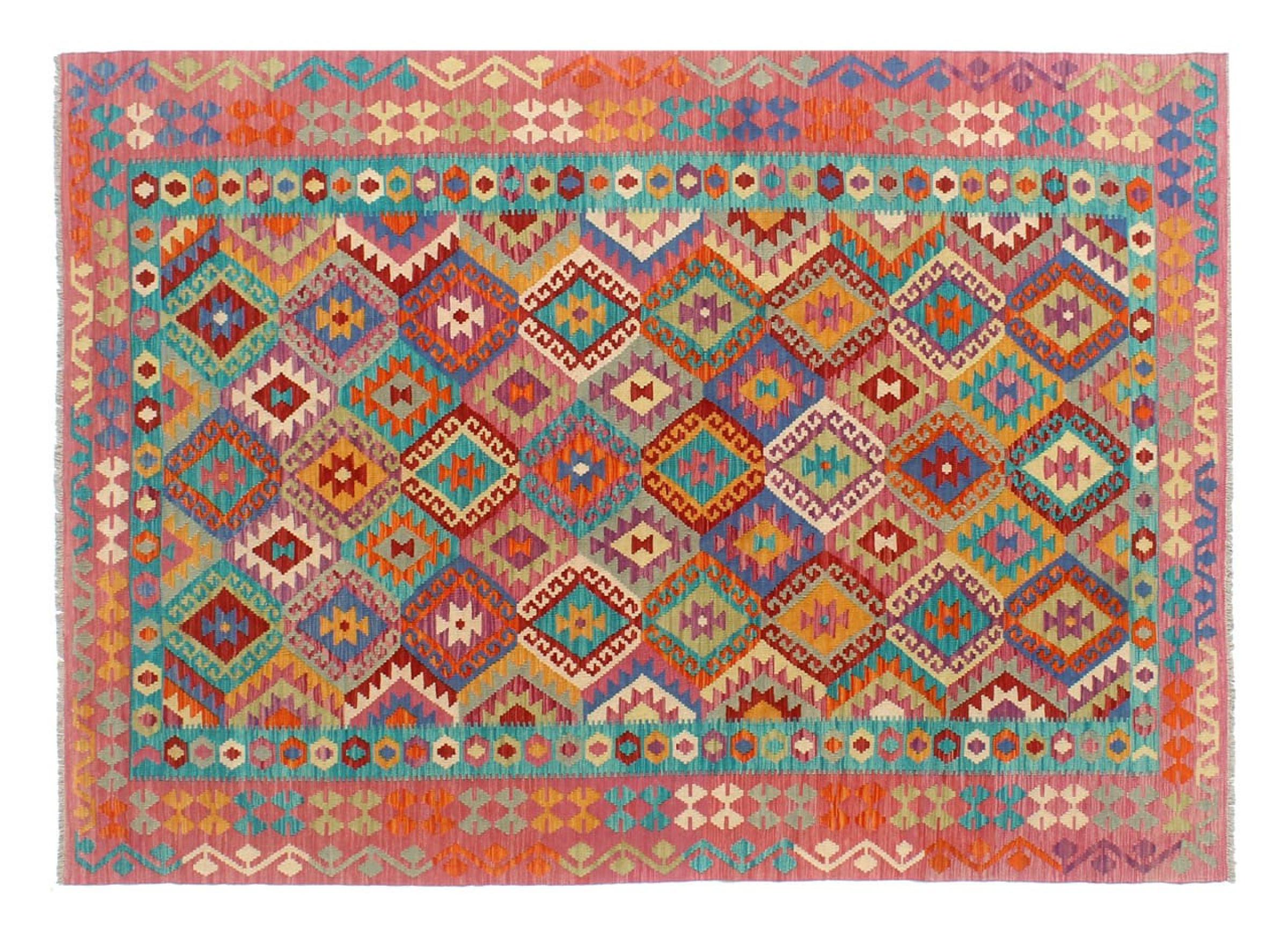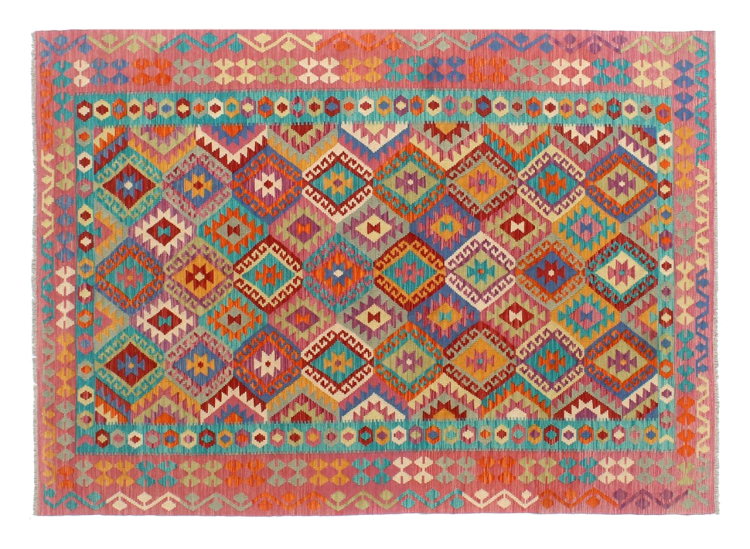 Questo kilim - afghano tessuto a mano è bello sia per i suoi colori e sia per il modello tipico. È stato tessuto a mano in Afghanistan con il 100% di lana. È anche robusto e durevole. Un vero e proprio profitto per voi e per la vostra casa.