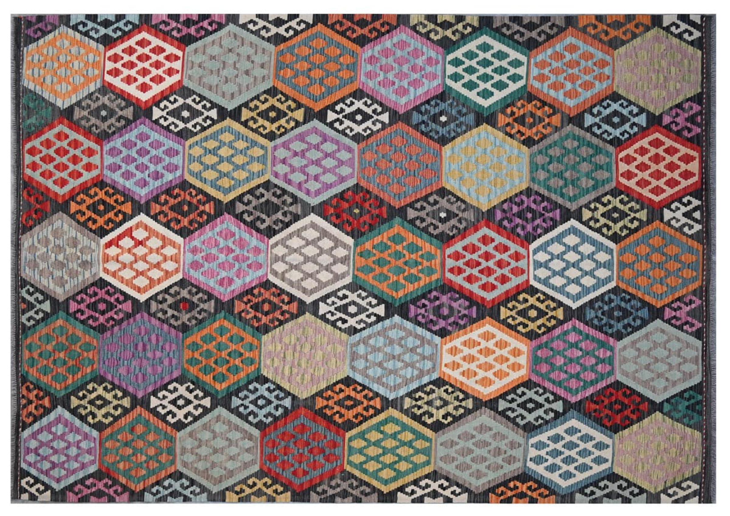 Questo kilim - afghano tessuto a mano è bello sia per i suoi colori e sia per il modello tipico. È stato tessuto a mano in Afghanistan con il 100% di lana. È anche robusto e durevole. Un vero e proprio profitto per voi e per la vostra casa.