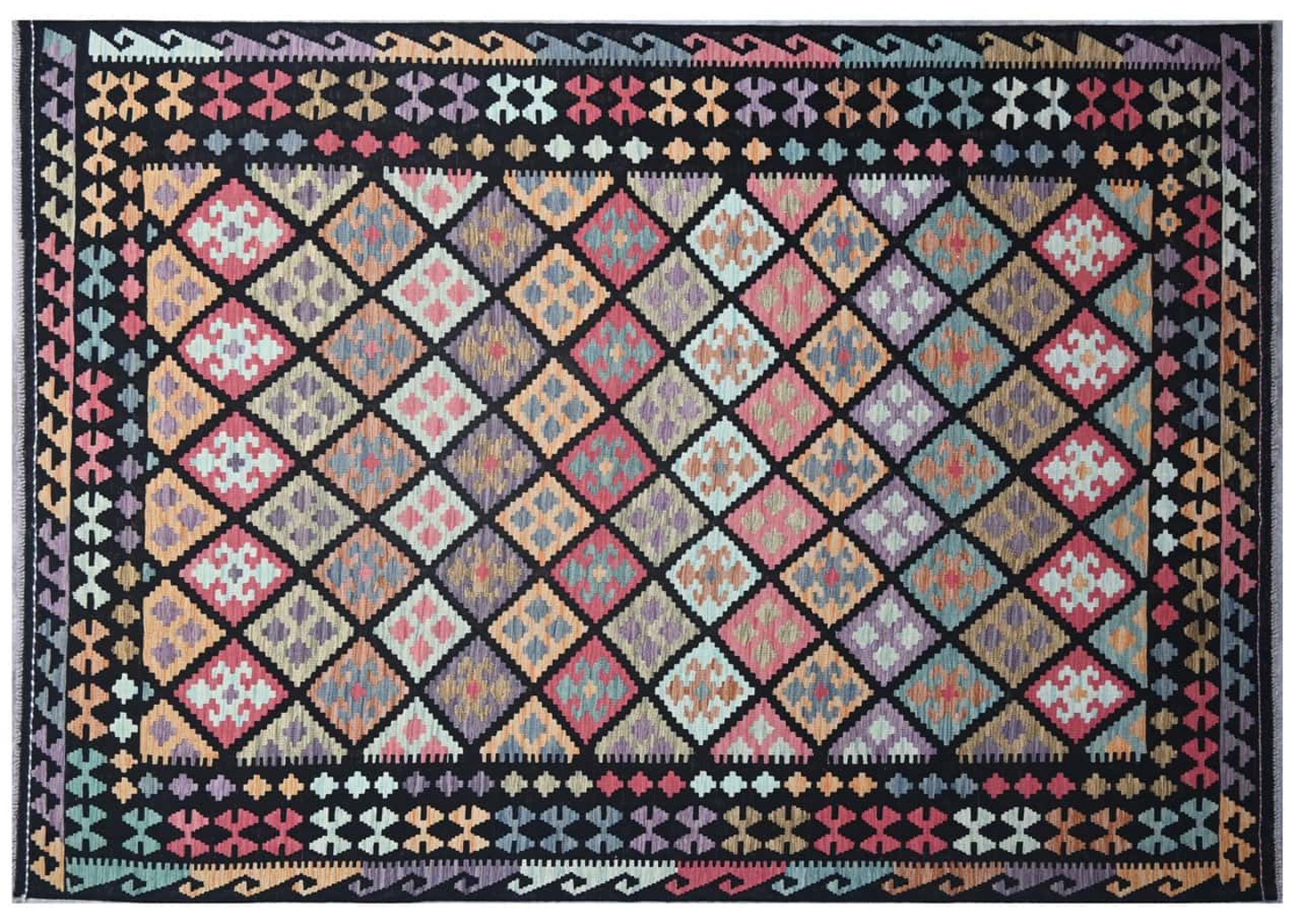 Questo kilim - afghano tessuto a mano è bello sia per i suoi colori e sia per il modello tipico. È stato tessuto a mano in Afghanistan con il 100% di lana. È anche robusto e durevole. Un vero e proprio profitto per voi e per la vostra casa.