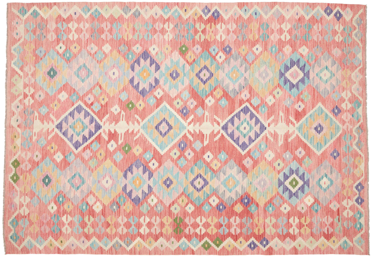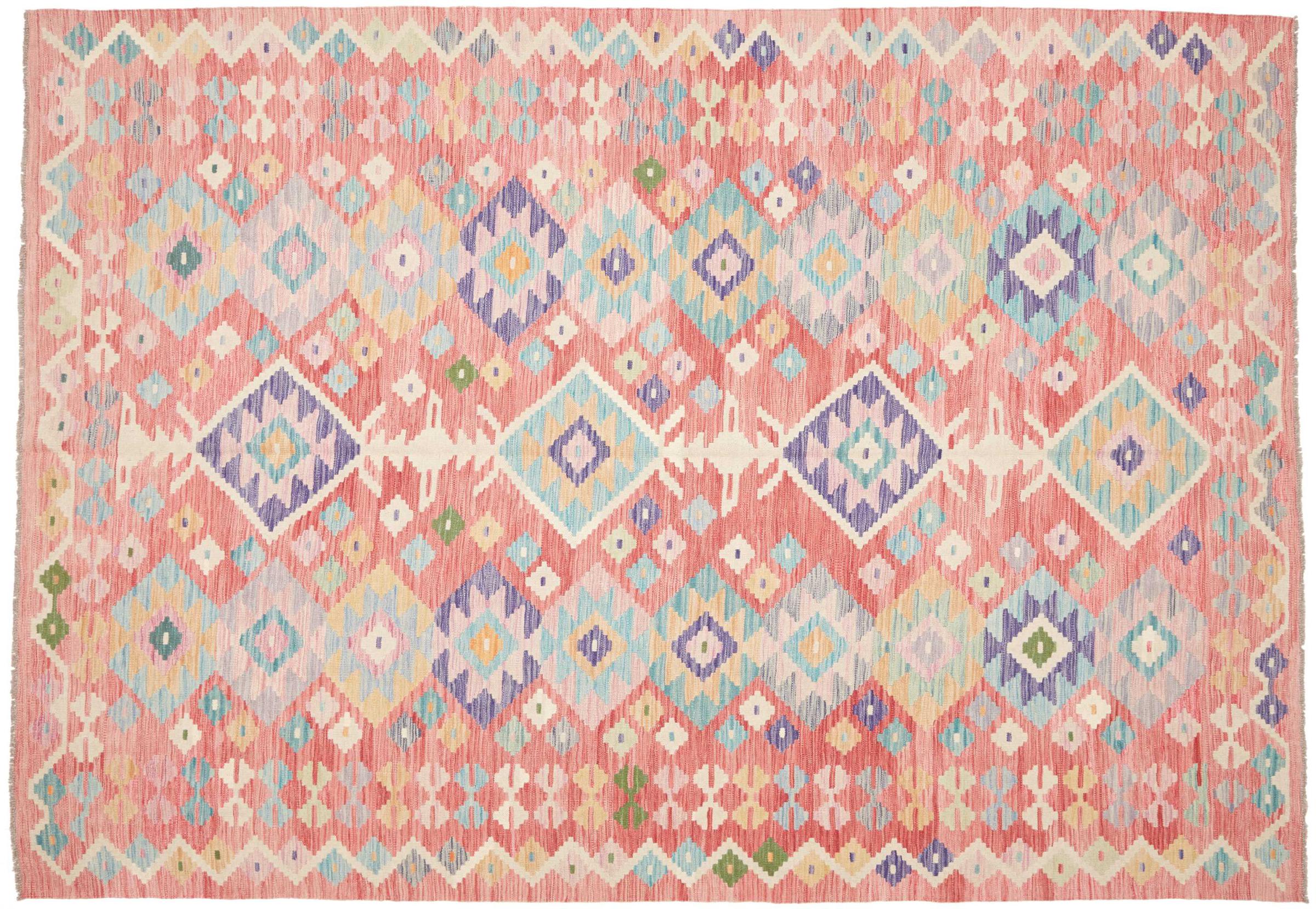 Questo kilim - afghano tessuto a mano è bello sia per i suoi colori e sia per il modello tipico. È stato tessuto a mano in Afghanistan con il 100% di lana. È anche robusto e durevole. Un vero e proprio profitto per voi e per la vostra casa.
