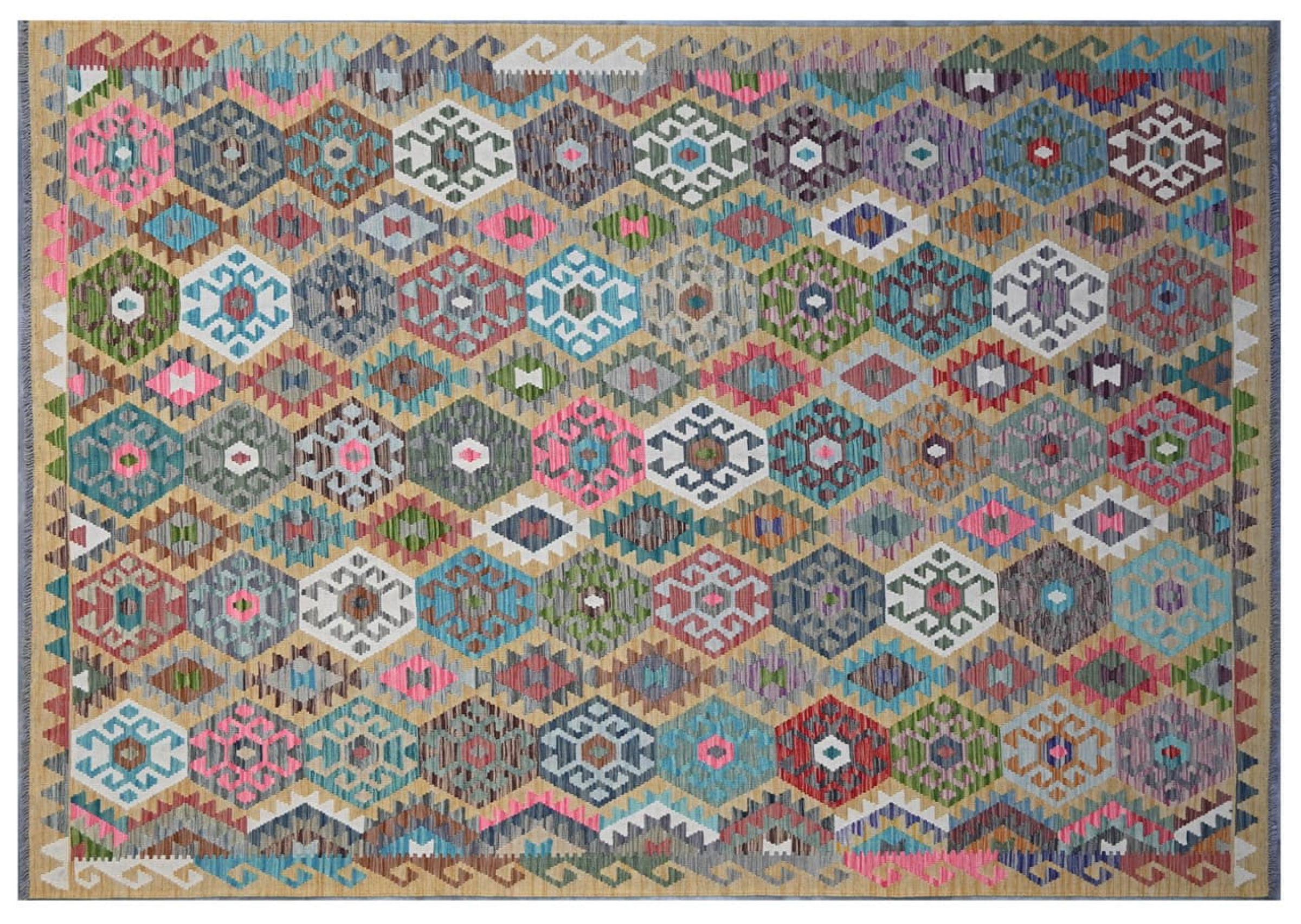 Questo kilim - afghano tessuto a mano è bello sia per i suoi colori e sia per il modello tipico. È stato tessuto a mano in Afghanistan con il 100% di lana. È anche robusto e durevole. Un vero e proprio profitto per voi e per la vostra casa.