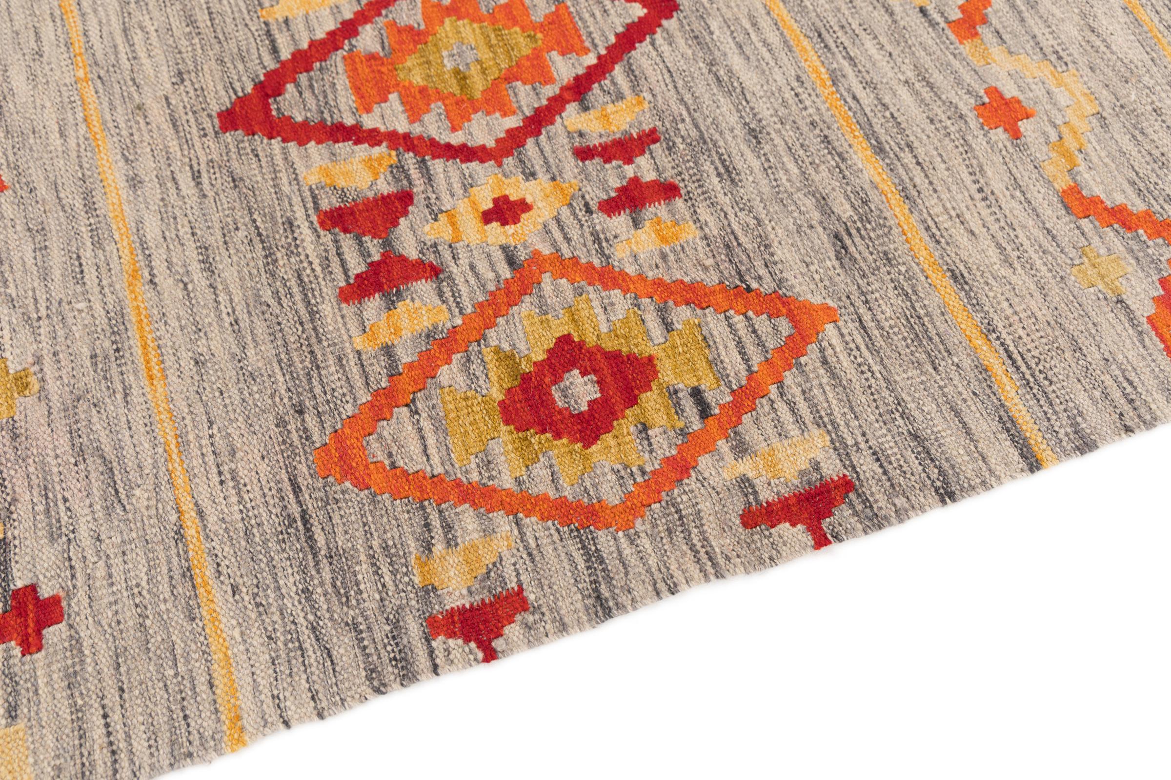 Questo tappeto è stato realizzato a mano su un telaio come una trama piatta. Flatweave è il termine usato per descrivere i tappeti che non hanno pelo. Come promette il nome, questi tappeti sono tessuti e non annodati. Il risultato è un tappeto piatto con una superficie strutturata. Le trame piatte non sono così morbide e di solito più sottili dei tappeti annodati. Allo stesso tempo sono molto meno complessi da produrre e di solito possono essere disposti da entrambi i lati (davanti e dietro). I loro motivi sono di solito geometrici, che è determinato dal tessuto.