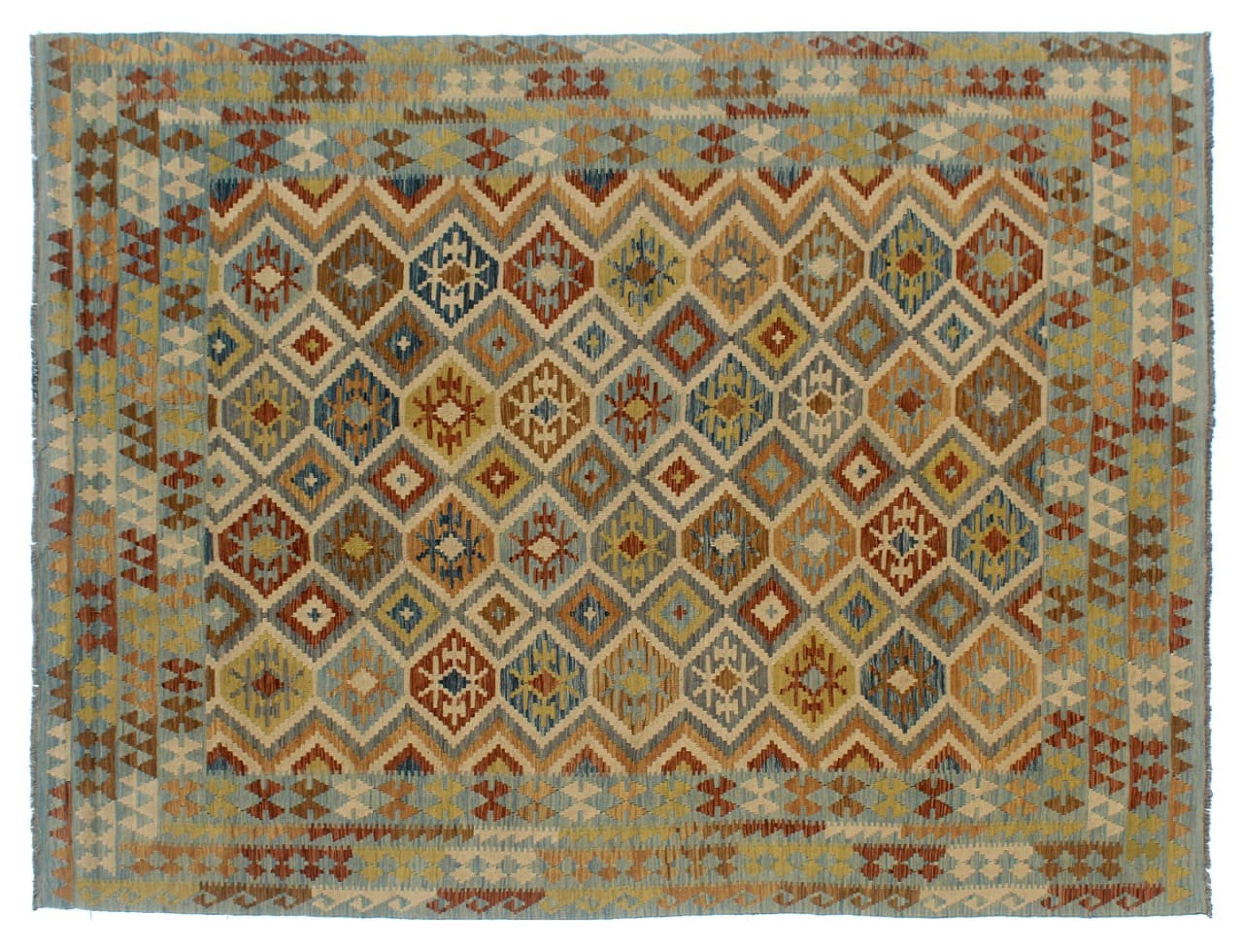 Questo kilim - afghano tessuto a mano è bello sia per i suoi colori e sia per il modello tipico. È stato tessuto a mano in Afghanistan con il 100% di lana. È anche robusto e durevole. Un vero e proprio profitto per voi e per la vostra casa.