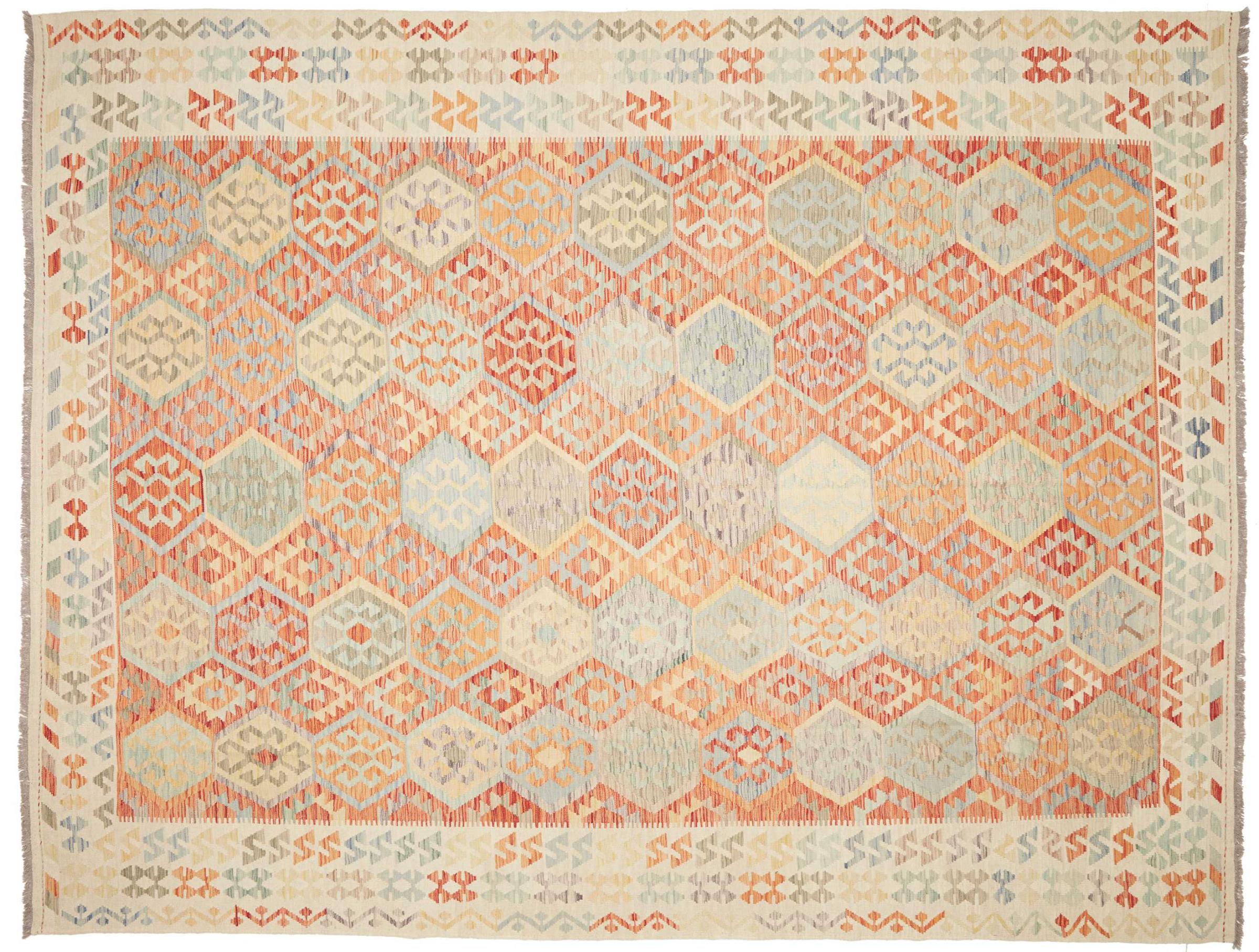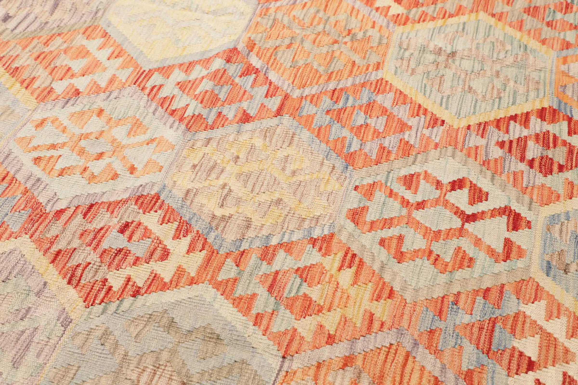 Questo kilim - afghano tessuto a mano è bello sia per i suoi colori e sia per il modello tipico. È stato tessuto a mano in Afghanistan con il 100% di lana. È anche robusto e durevole. Un vero e proprio profitto per voi e per la vostra casa.