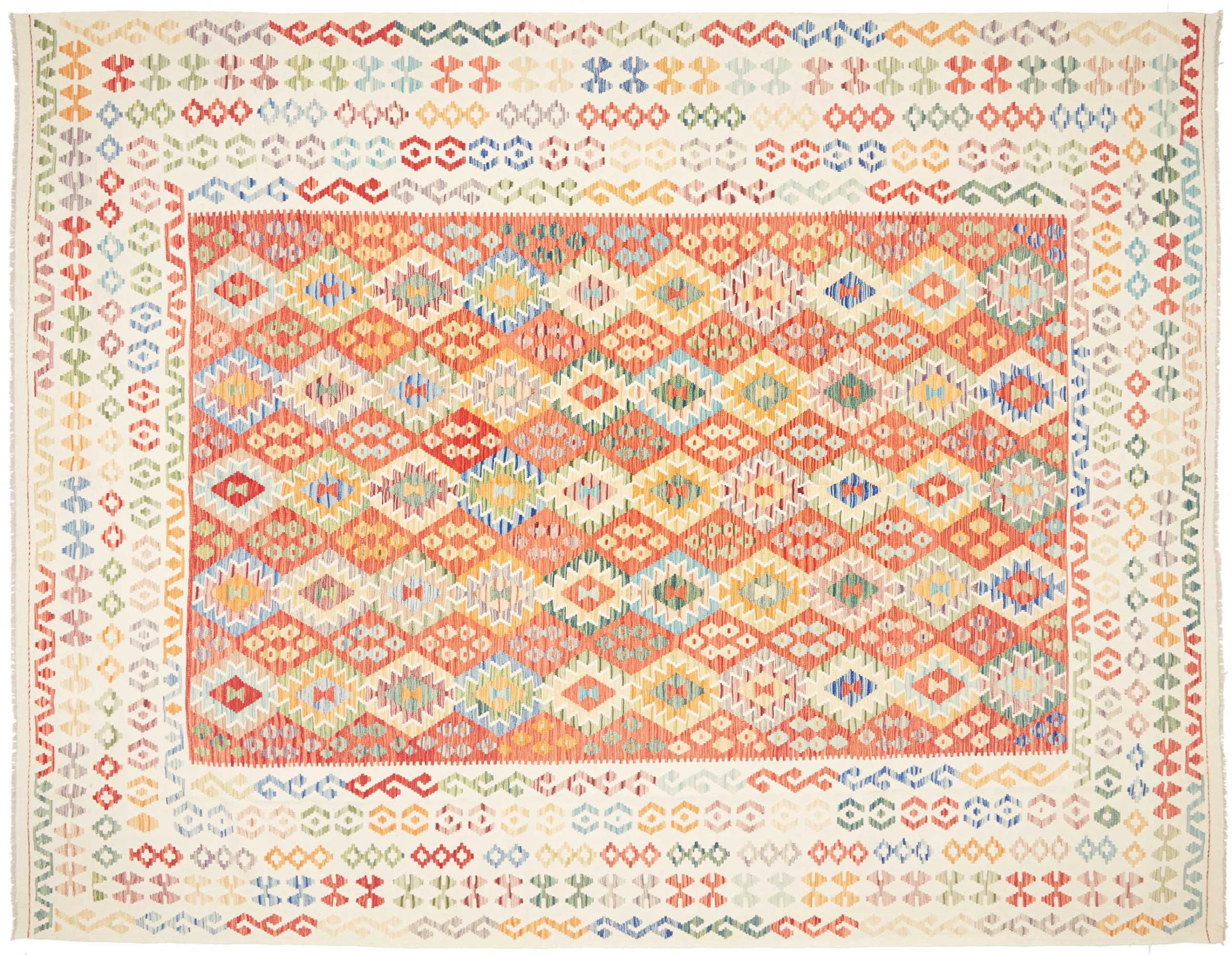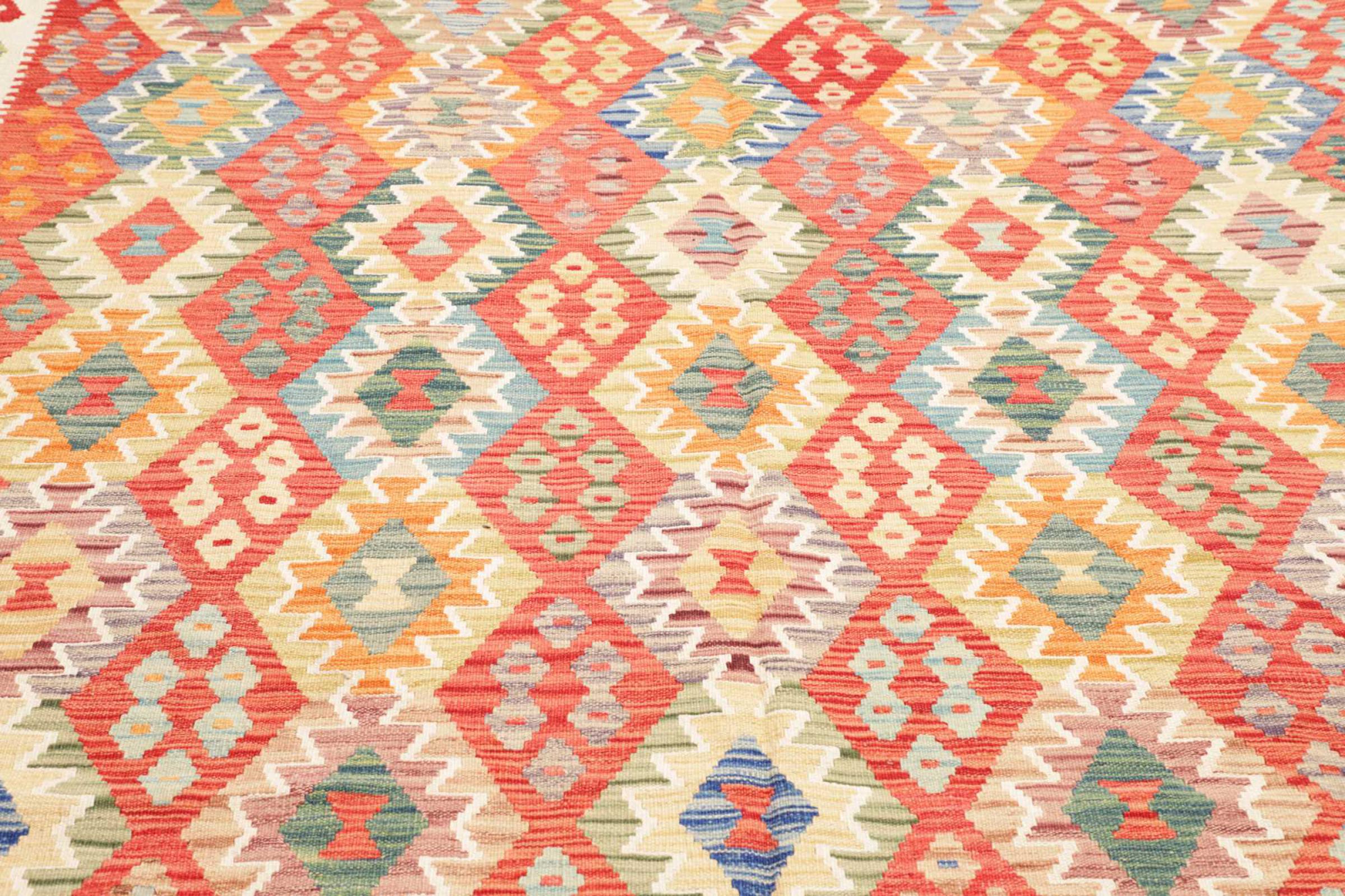 Questo kilim - afghano tessuto a mano è bello sia per i suoi colori e sia per il modello tipico. È stato tessuto a mano in Afghanistan con il 100% di lana. È anche robusto e durevole. Un vero e proprio profitto per voi e per la vostra casa.