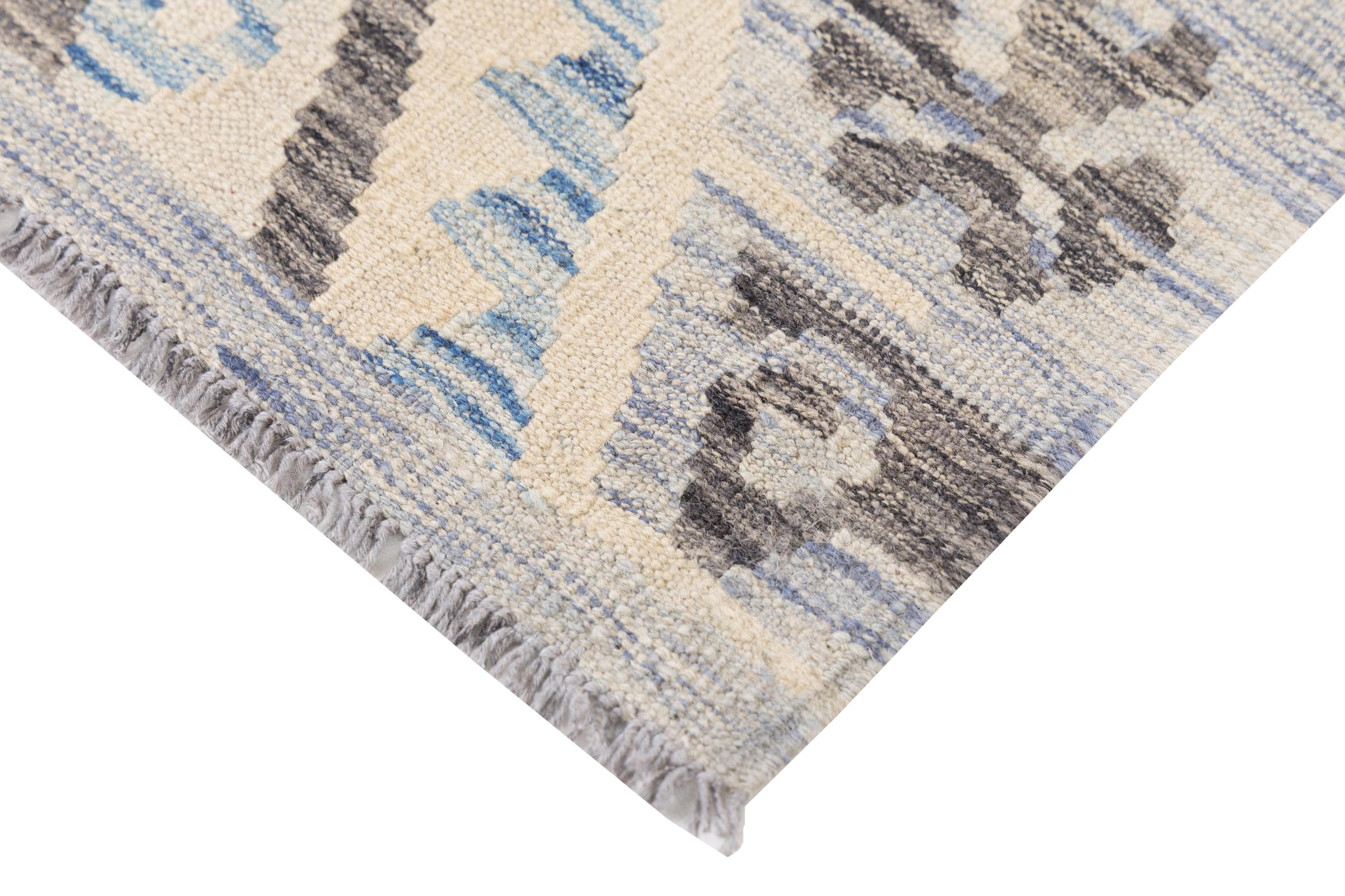 Questo tappeto è stato realizzato a mano su un telaio come una trama piatta. Flatweave è il termine usato per descrivere i tappeti che non hanno pelo. Come promette il nome, questi tappeti sono tessuti e non annodati. Il risultato è un tappeto piatto con una superficie strutturata. Le trame piatte non sono così morbide e di solito più sottili dei tappeti annodati. Allo stesso tempo sono molto meno complessi da produrre e di solito possono essere disposti da entrambi i lati (davanti e dietro). I loro motivi sono di solito geometrici, che è determinato dal tessuto.