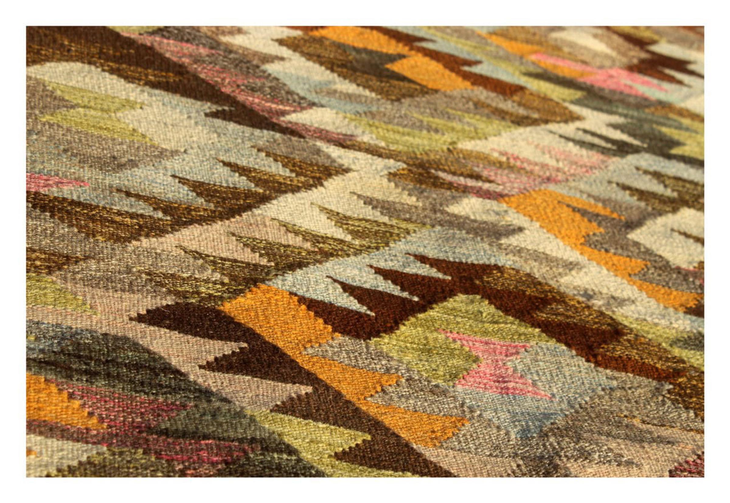 Questo tappeto è stato realizzato a mano su un telaio come una trama piatta. Flatweave è il termine usato per descrivere i tappeti che non hanno pelo. Come promette il nome, questi tappeti sono tessuti e non annodati. Il risultato è un tappeto piatto con una superficie strutturata. Le trame piatte non sono così morbide e di solito più sottili dei tappeti annodati. Allo stesso tempo sono molto meno complessi da produrre e di solito possono essere disposti da entrambi i lati (davanti e dietro). I loro motivi sono di solito geometrici, che è determinato dal tessuto.