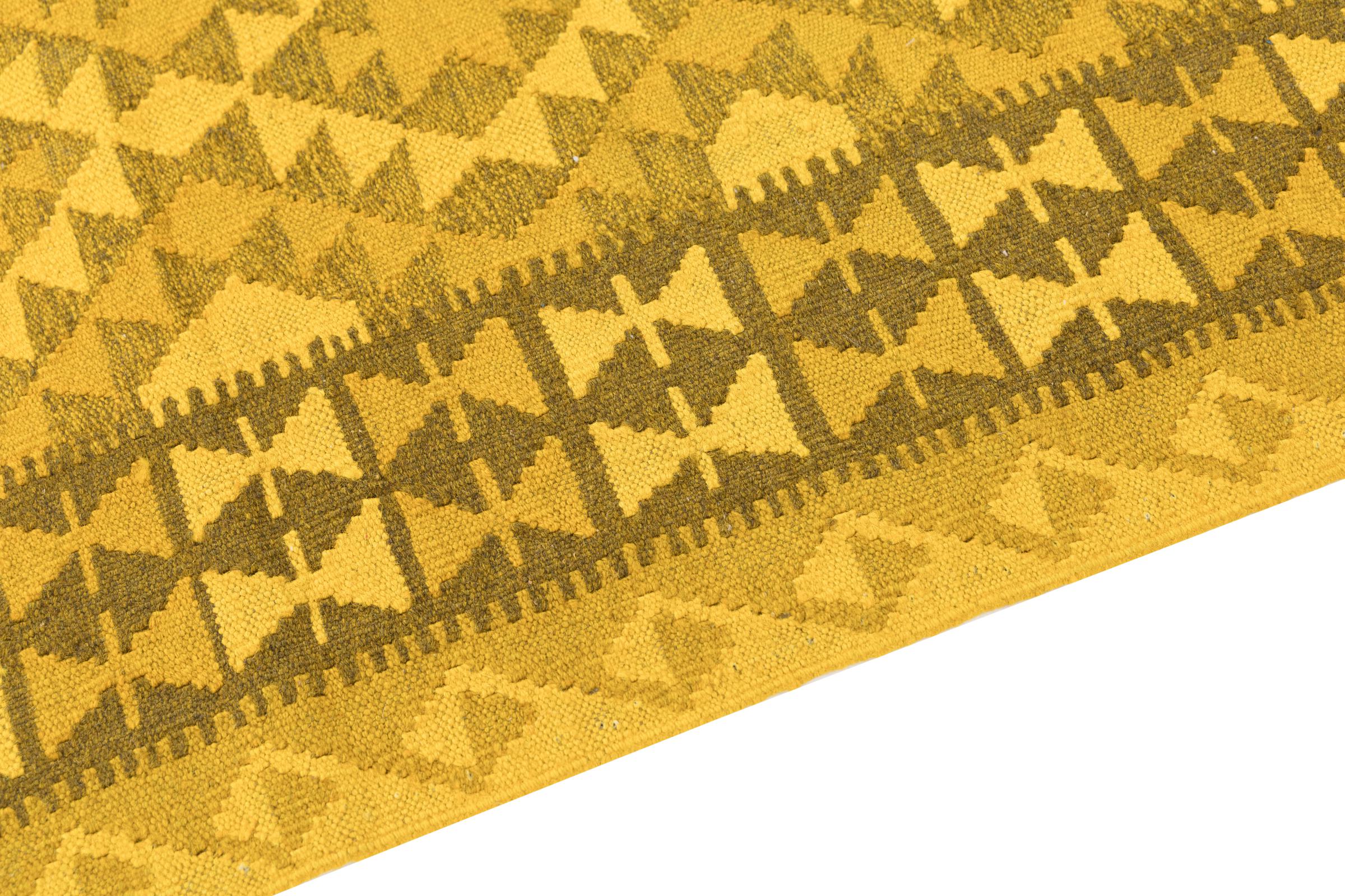 Questo tappeto è stato realizzato a mano su un telaio come una trama piatta. Flatweave è il termine usato per descrivere i tappeti che non hanno pelo. Come promette il nome, questi tappeti sono tessuti e non annodati. Il risultato è un tappeto piatto con una superficie strutturata. Le trame piatte non sono così morbide e di solito più sottili dei tappeti annodati. Allo stesso tempo sono molto meno complessi da produrre e di solito possono essere disposti da entrambi i lati (davanti e dietro). I loro motivi sono di solito geometrici, che è determinato dal tessuto.