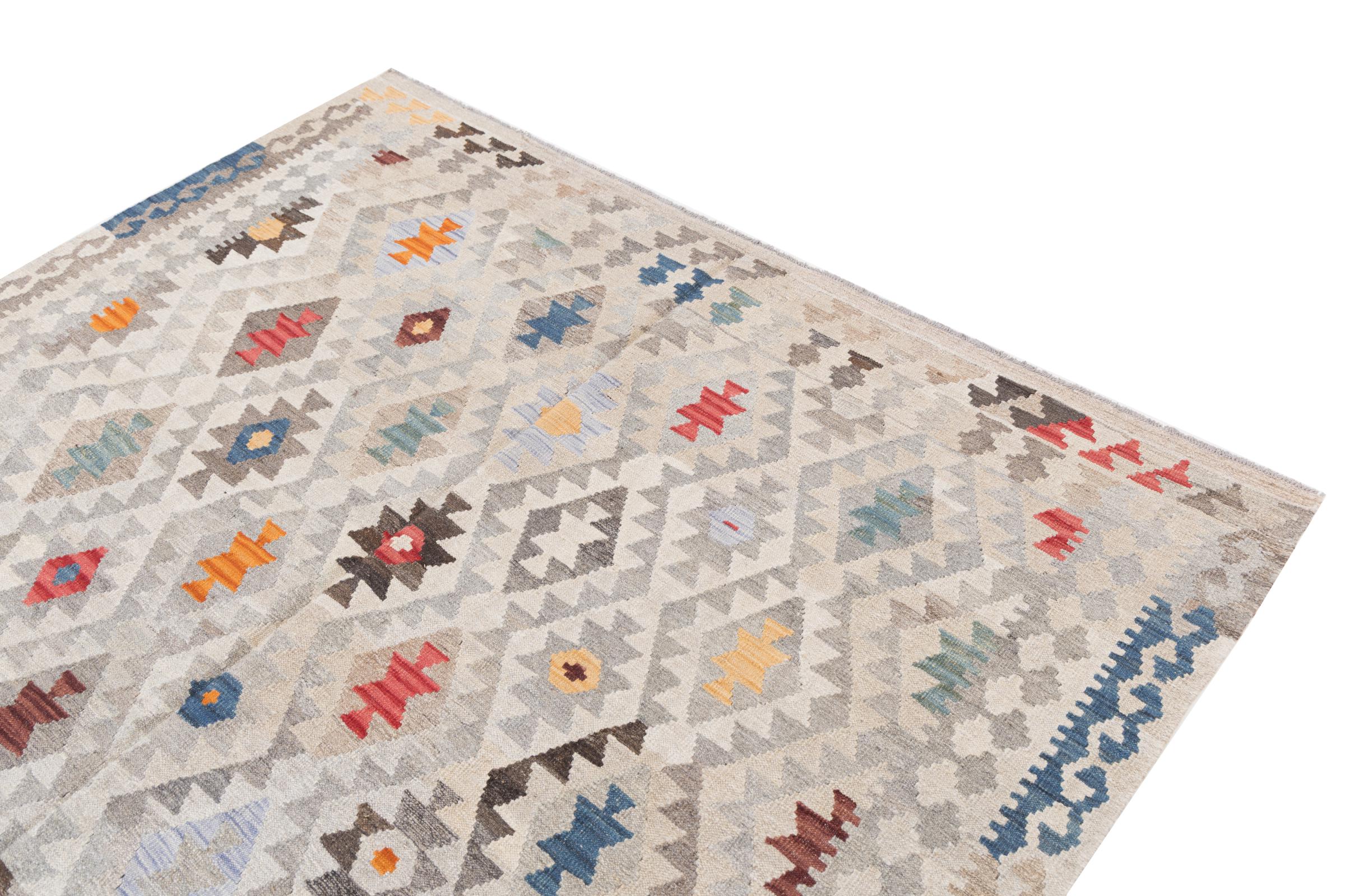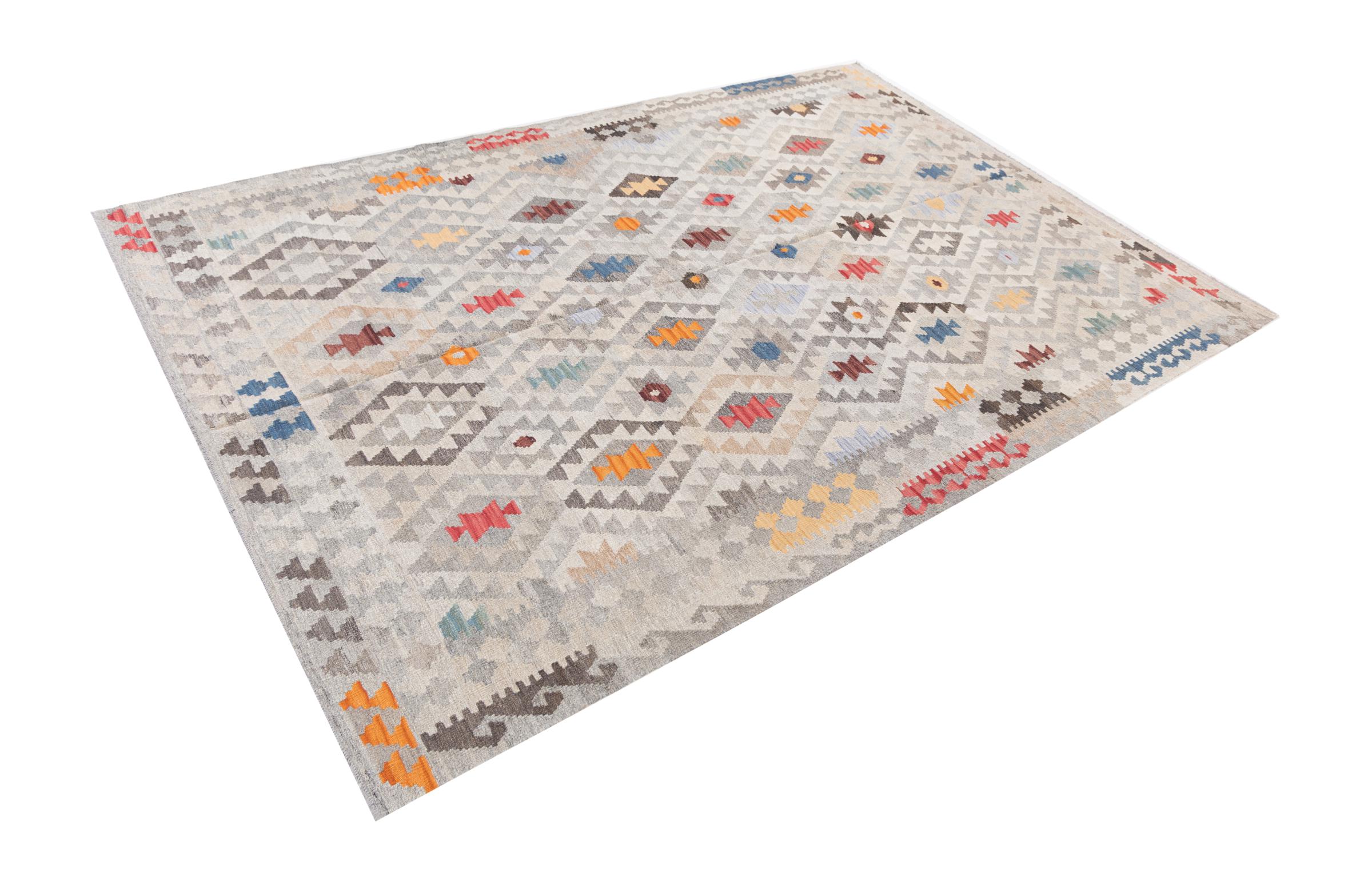 Questo tappeto kilim è molto speciale perché non solo è tessuto a mano, ma anche la sua lana è filata a mano. La collezione Kilim Heritage offre un design estremamente moderno in colori pastello e in combinazione con l'artigianato più tradizionale dell'Oriente. Grande valore e totalmente accessibile. Non troverai più un pezzo unico come questo.