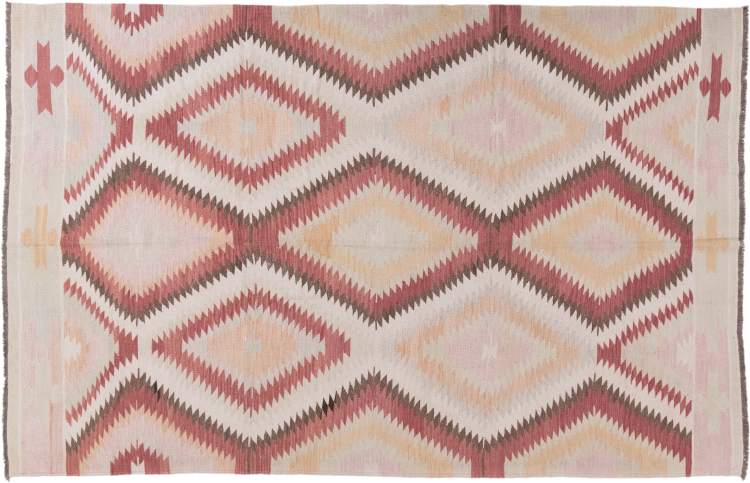 Questo tappeto è stato realizzato a mano su un telaio come una trama piatta. Flatweave è il termine usato per descrivere i tappeti che non hanno pelo. Come promette il nome, questi tappeti sono tessuti e non annodati. Il risultato è un tappeto piatto con una superficie strutturata. Le trame piatte non sono così morbide e di solito più sottili dei tappeti annodati. Allo stesso tempo sono molto meno complessi da produrre e di solito possono essere disposti da entrambi i lati (davanti e dietro). I loro motivi sono di solito geometrici, che è determinato dal tessuto.