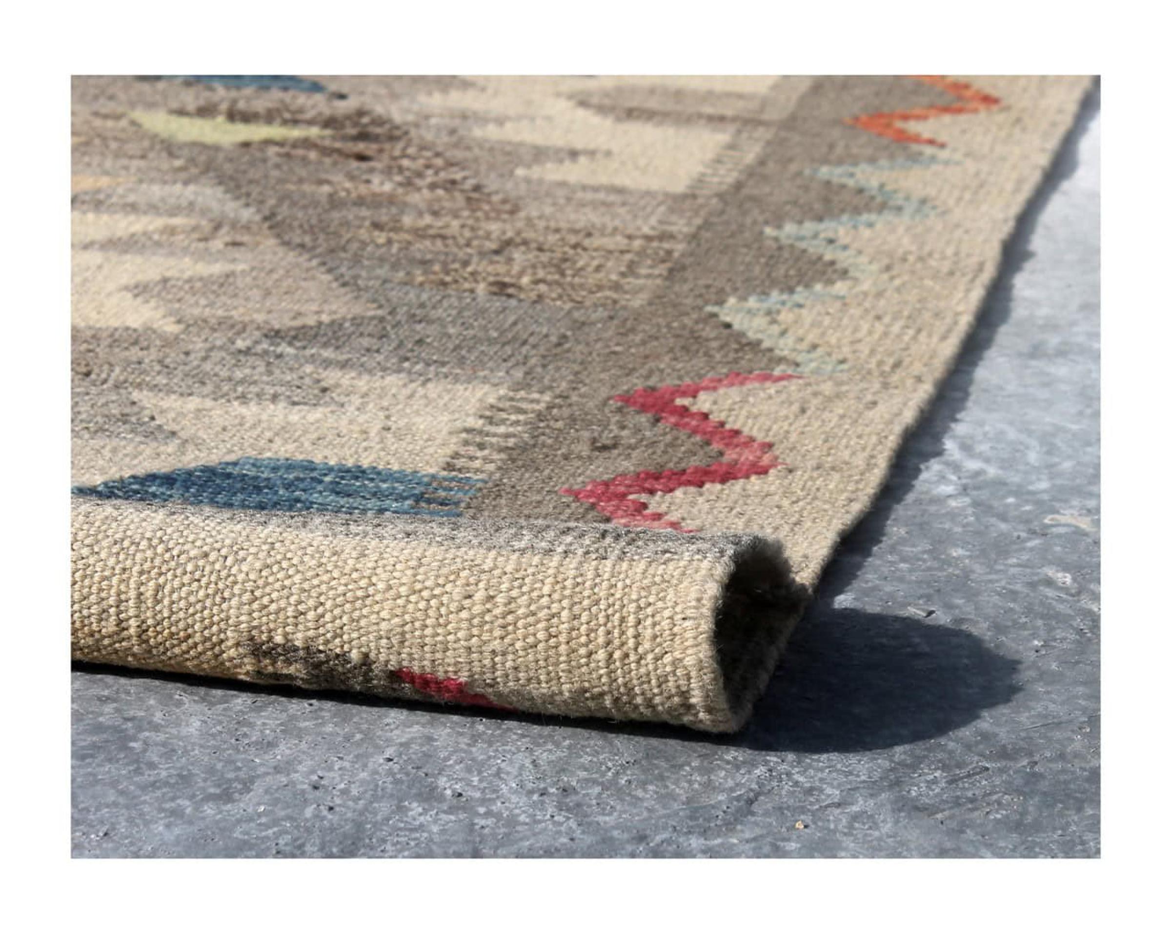 Questo tappeto è stato realizzato a mano su un telaio come una trama piatta. Flatweave è il termine usato per descrivere i tappeti che non hanno pelo. Come promette il nome, questi tappeti sono tessuti e non annodati. Il risultato è un tappeto piatto con una superficie strutturata. Le trame piatte non sono così morbide e di solito più sottili dei tappeti annodati. Allo stesso tempo sono molto meno complessi da produrre e di solito possono essere disposti da entrambi i lati (davanti e dietro). I loro motivi sono di solito geometrici, che è determinato dal tessuto.