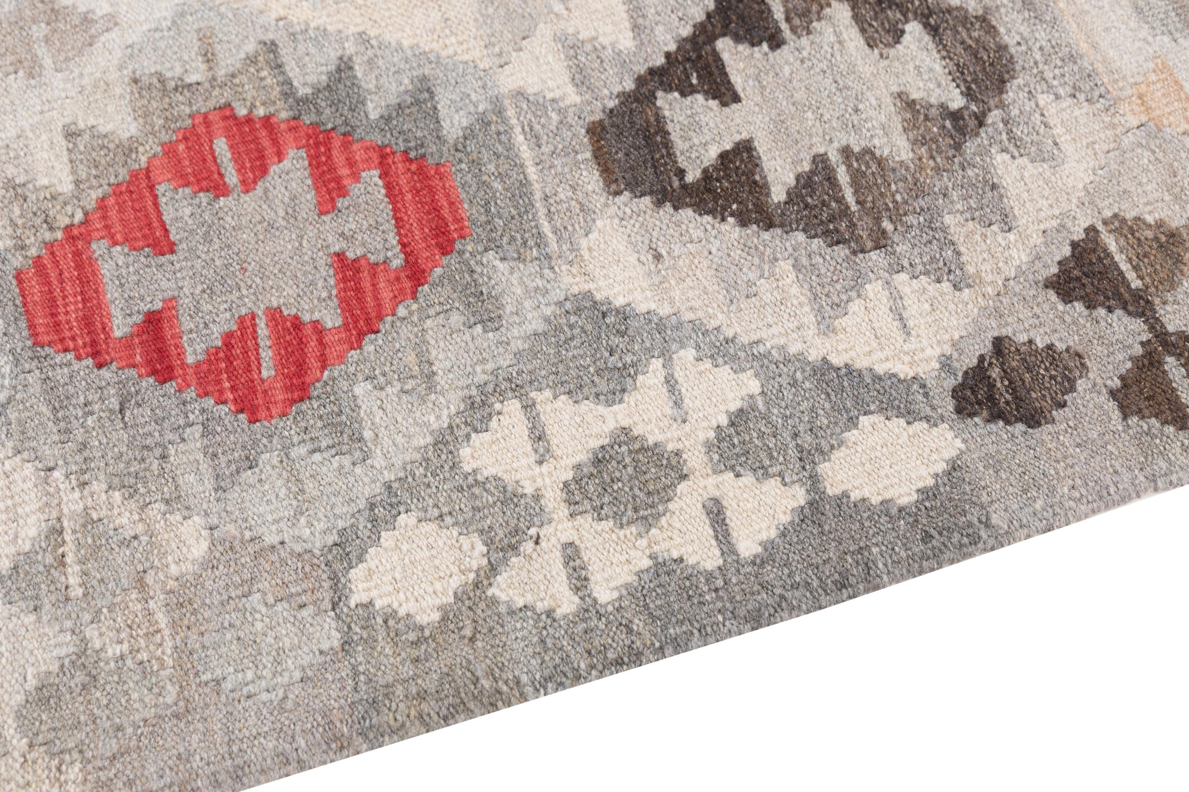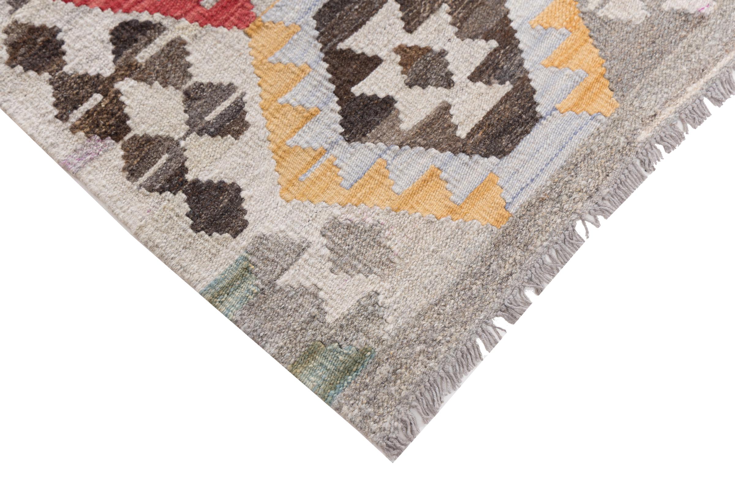 Questo tappeto è stato realizzato a mano su un telaio come una trama piatta. Flatweave è il termine usato per descrivere i tappeti che non hanno pelo. Come promette il nome, questi tappeti sono tessuti e non annodati. Il risultato è un tappeto piatto con una superficie strutturata. Le trame piatte non sono così morbide e di solito più sottili dei tappeti annodati. Allo stesso tempo sono molto meno complessi da produrre e di solito possono essere disposti da entrambi i lati (davanti e dietro). I loro motivi sono di solito geometrici, che è determinato dal tessuto.