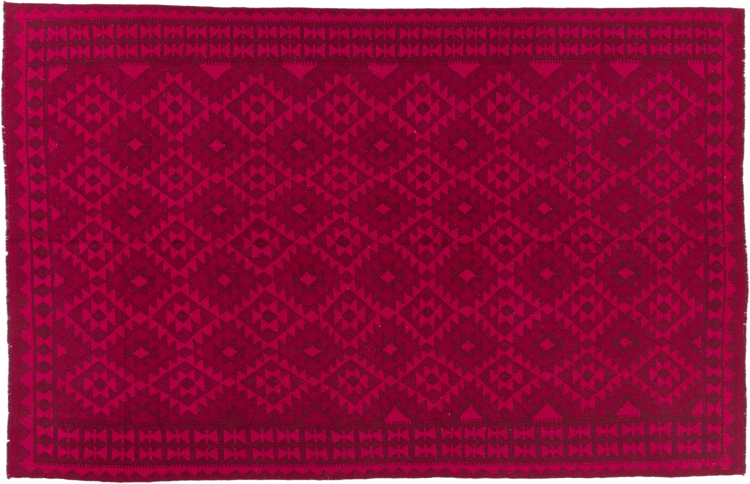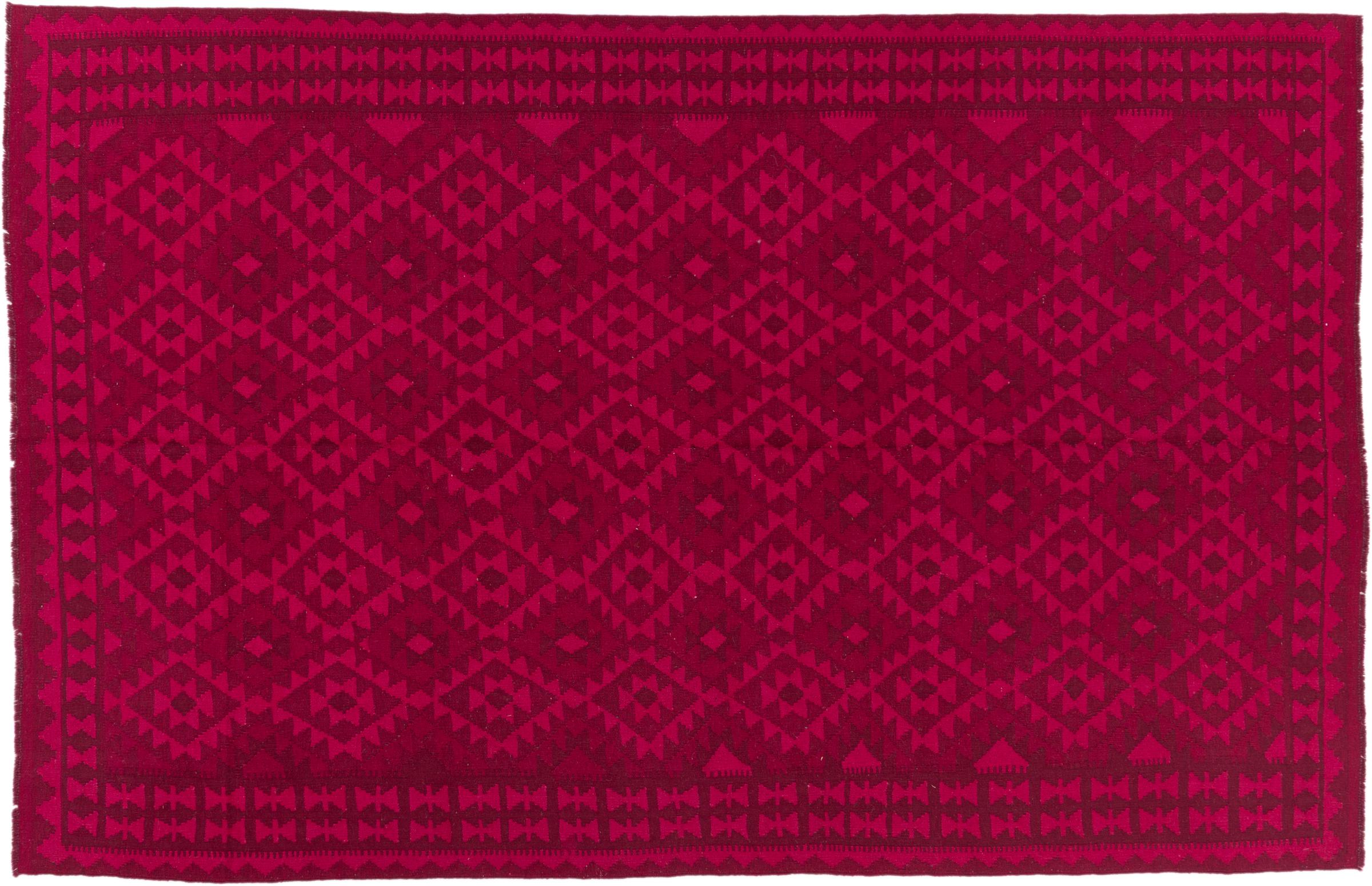 Questo tappeto è stato realizzato a mano su un telaio come una trama piatta. Flatweave è il termine usato per descrivere i tappeti che non hanno pelo. Come promette il nome, questi tappeti sono tessuti e non annodati. Il risultato è un tappeto piatto con una superficie strutturata. Le trame piatte non sono così morbide e di solito più sottili dei tappeti annodati. Allo stesso tempo sono molto meno complessi da produrre e di solito possono essere disposti da entrambi i lati (davanti e dietro). I loro motivi sono di solito geometrici, che è determinato dal tessuto.