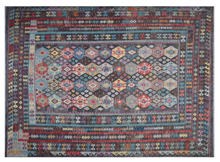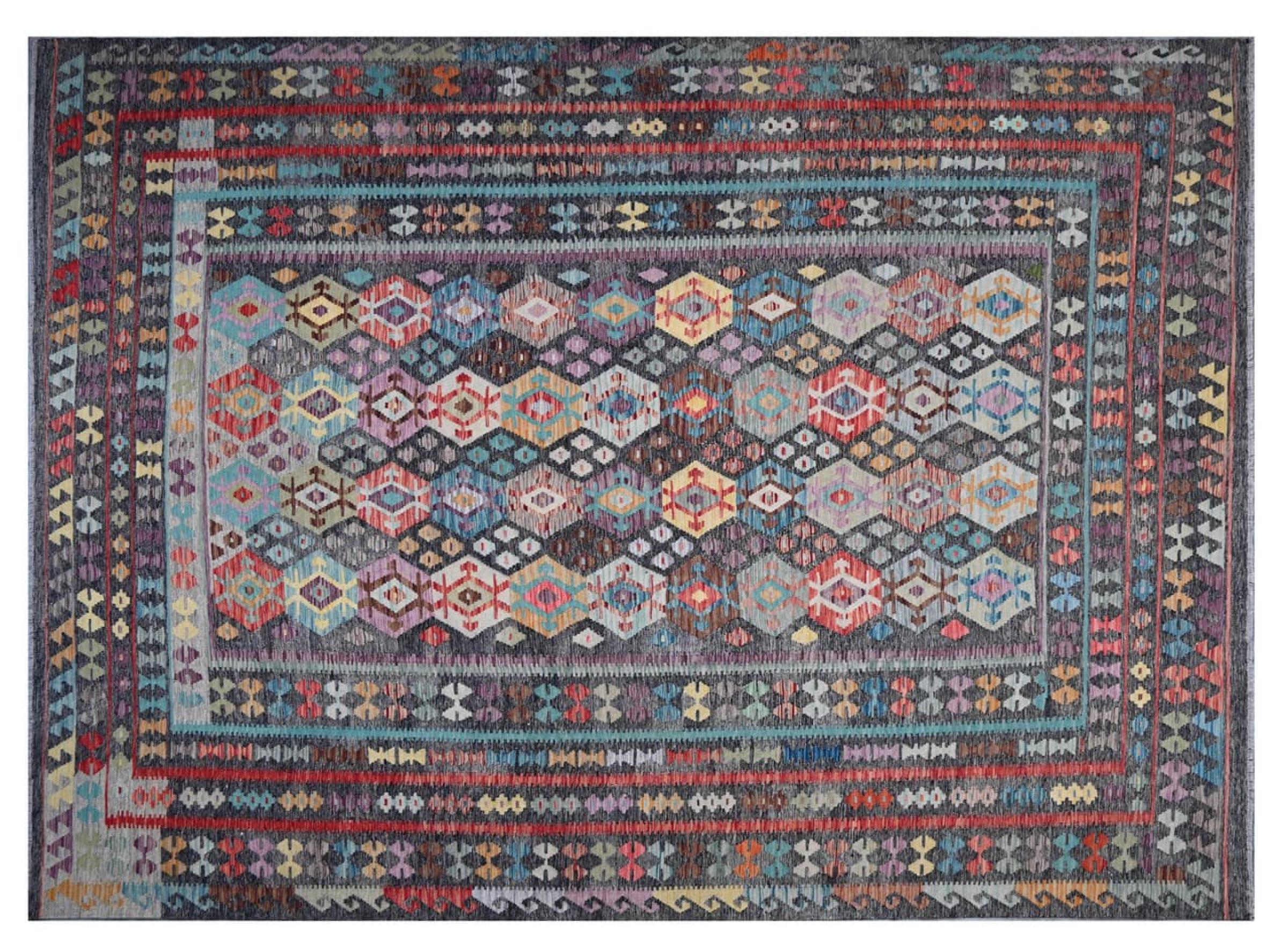 Questo kilim - afghano tessuto a mano è bello sia per i suoi colori e sia per il modello tipico. È stato tessuto a mano in Afghanistan con il 100% di lana. È anche robusto e durevole. Un vero e proprio profitto per voi e per la vostra casa.
