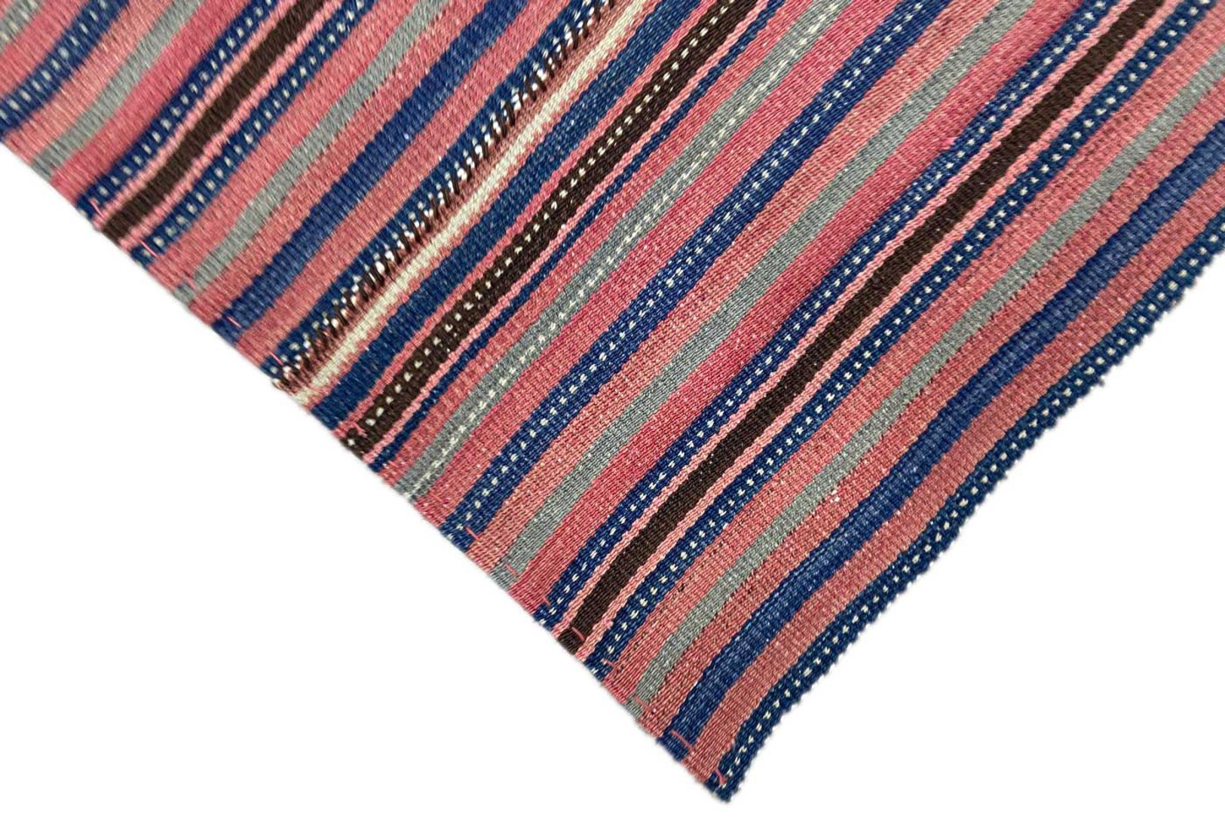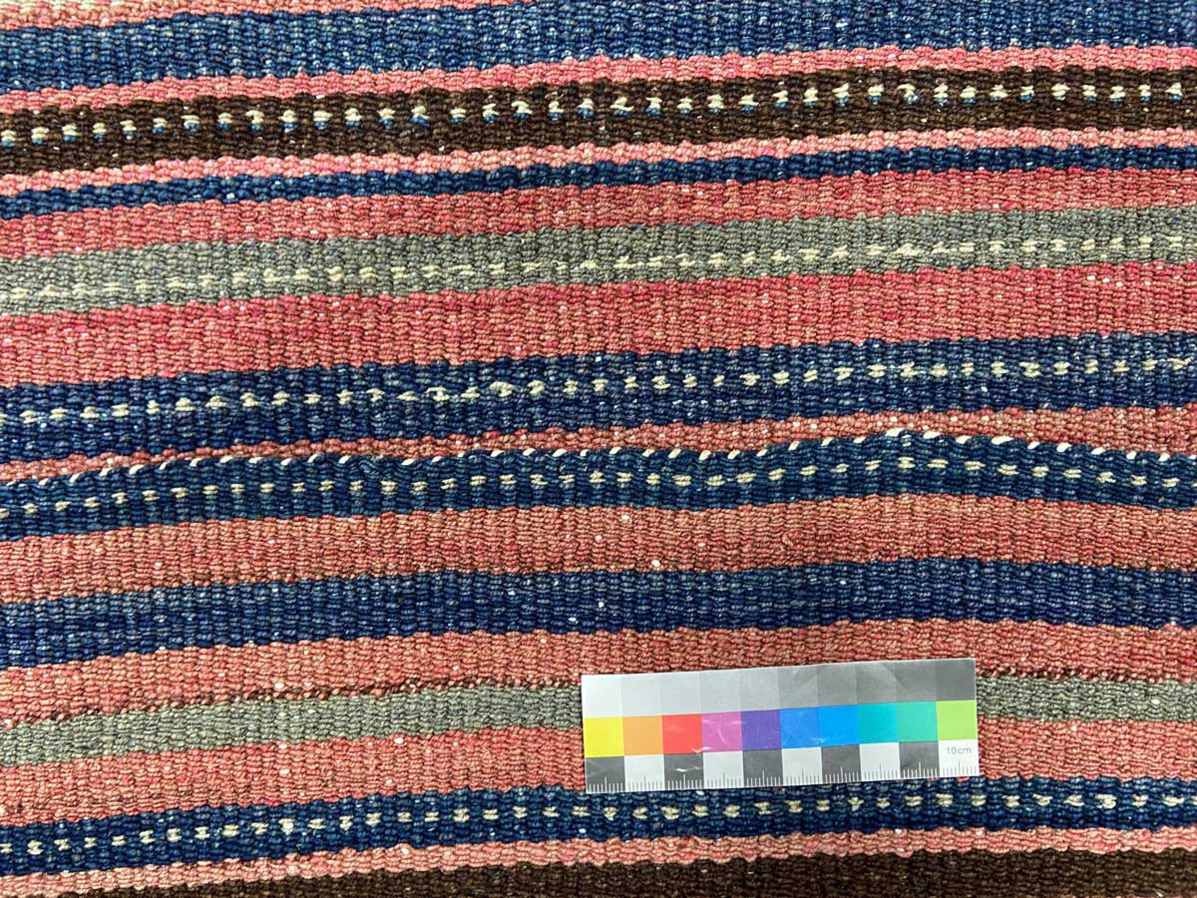 Questo tappeto è stato realizzato a mano su un telaio come una trama piatta. Flatweave è il termine usato per descrivere i tappeti che non hanno pelo. Come promette il nome, questi tappeti sono tessuti e non annodati. Il risultato è un tappeto piatto con una superficie strutturata. Le trame piatte non sono così morbide e di solito più sottili dei tappeti annodati. Allo stesso tempo sono molto meno complessi da produrre e di solito possono essere disposti da entrambi i lati (davanti e dietro). I loro motivi sono di solito geometrici, che è determinato dal tessuto.