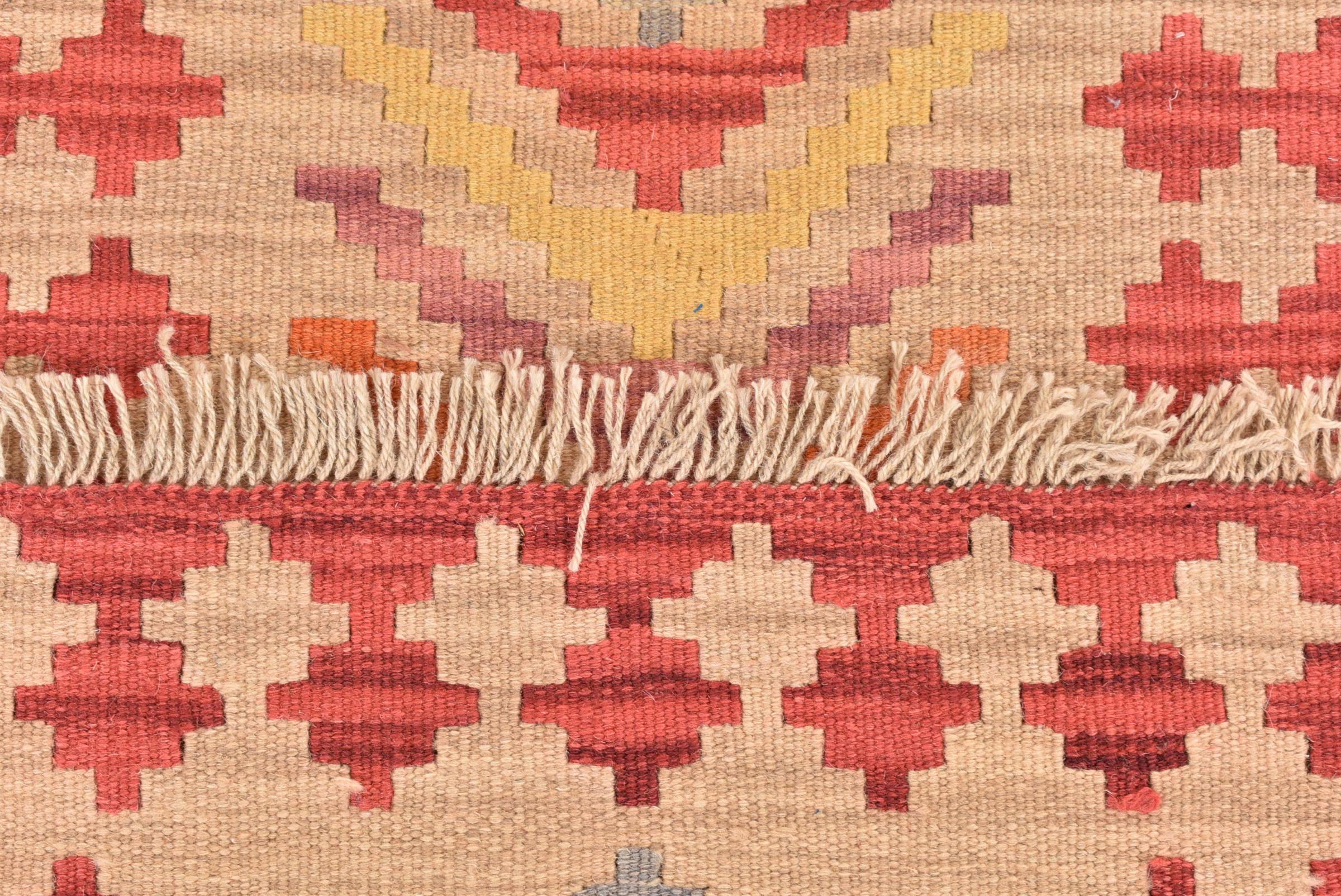 Questo tappeto è stato realizzato a mano su un telaio come una trama piatta. Flatweave è il termine usato per descrivere i tappeti che non hanno pelo. Come promette il nome, questi tappeti sono tessuti e non annodati. Il risultato è un tappeto piatto con una superficie strutturata. Le trame piatte non sono così morbide e di solito più sottili dei tappeti annodati. Allo stesso tempo sono molto meno complessi da produrre e di solito possono essere disposti da entrambi i lati (davanti e dietro). I loro motivi sono di solito geometrici, che è determinato dal tessuto.