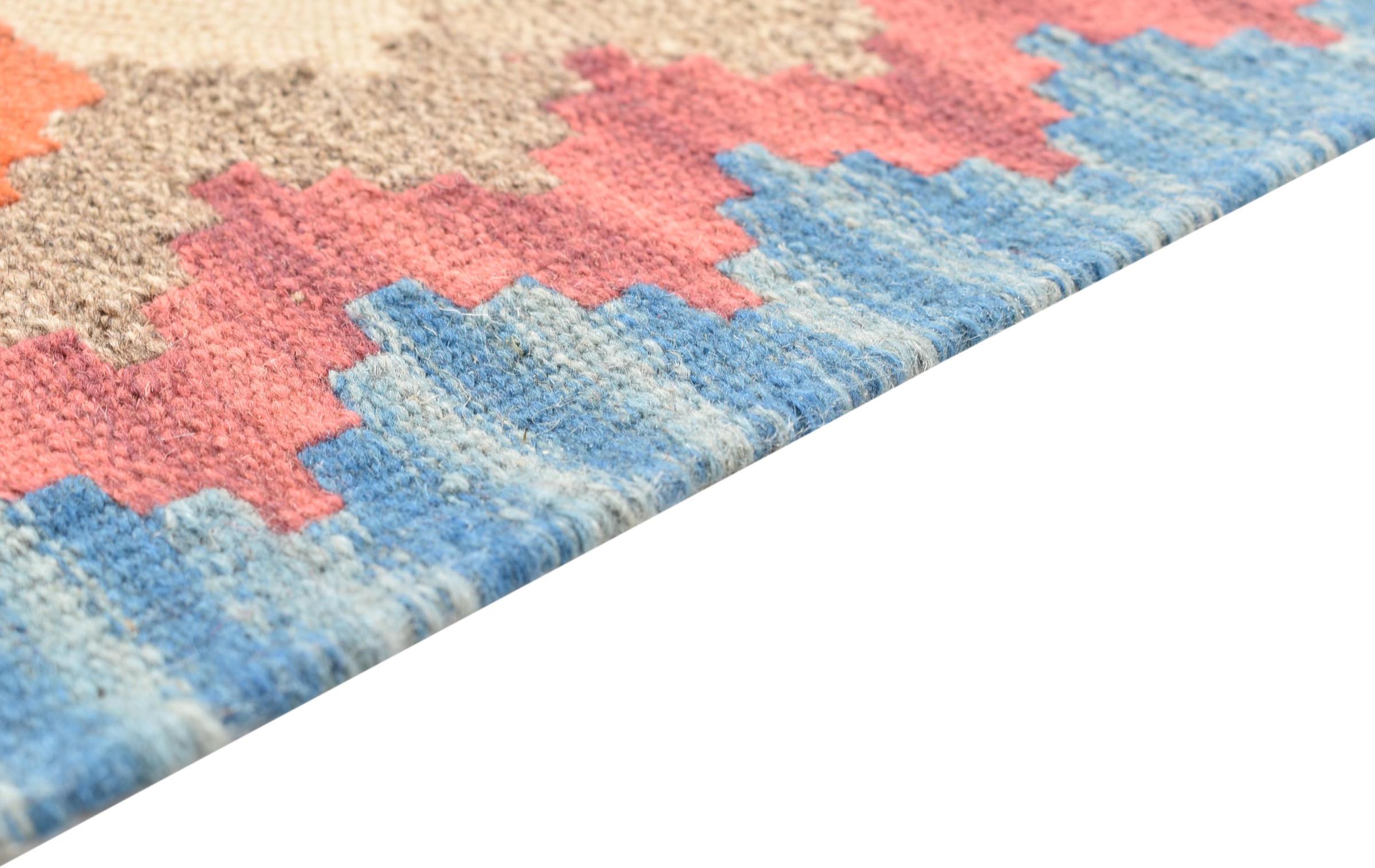 Questo tappeto è stato realizzato a mano su un telaio come una trama piatta. Flatweave è il termine usato per descrivere i tappeti che non hanno pelo. Come promette il nome, questi tappeti sono tessuti e non annodati. Il risultato è un tappeto piatto con una superficie strutturata. Le trame piatte non sono così morbide e di solito più sottili dei tappeti annodati. Allo stesso tempo sono molto meno complessi da produrre e di solito possono essere disposti da entrambi i lati (davanti e dietro). I loro motivi sono di solito geometrici, che è determinato dal tessuto.