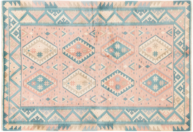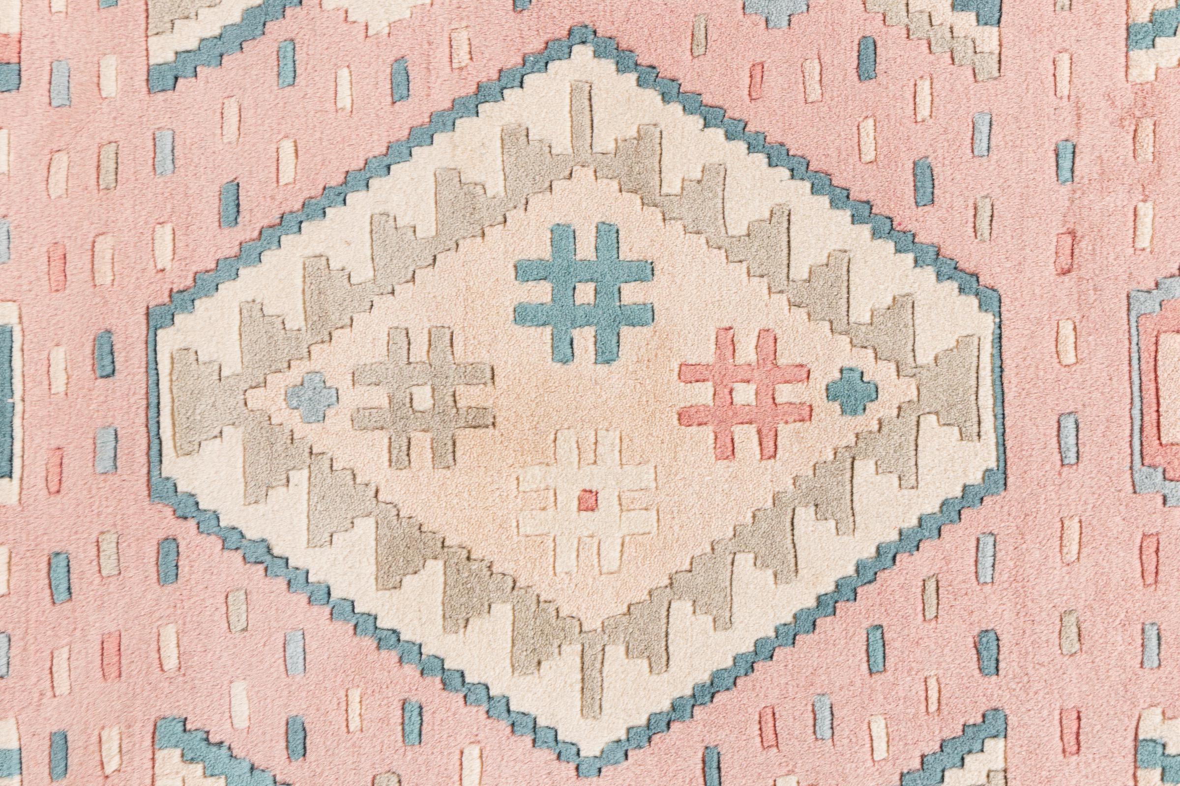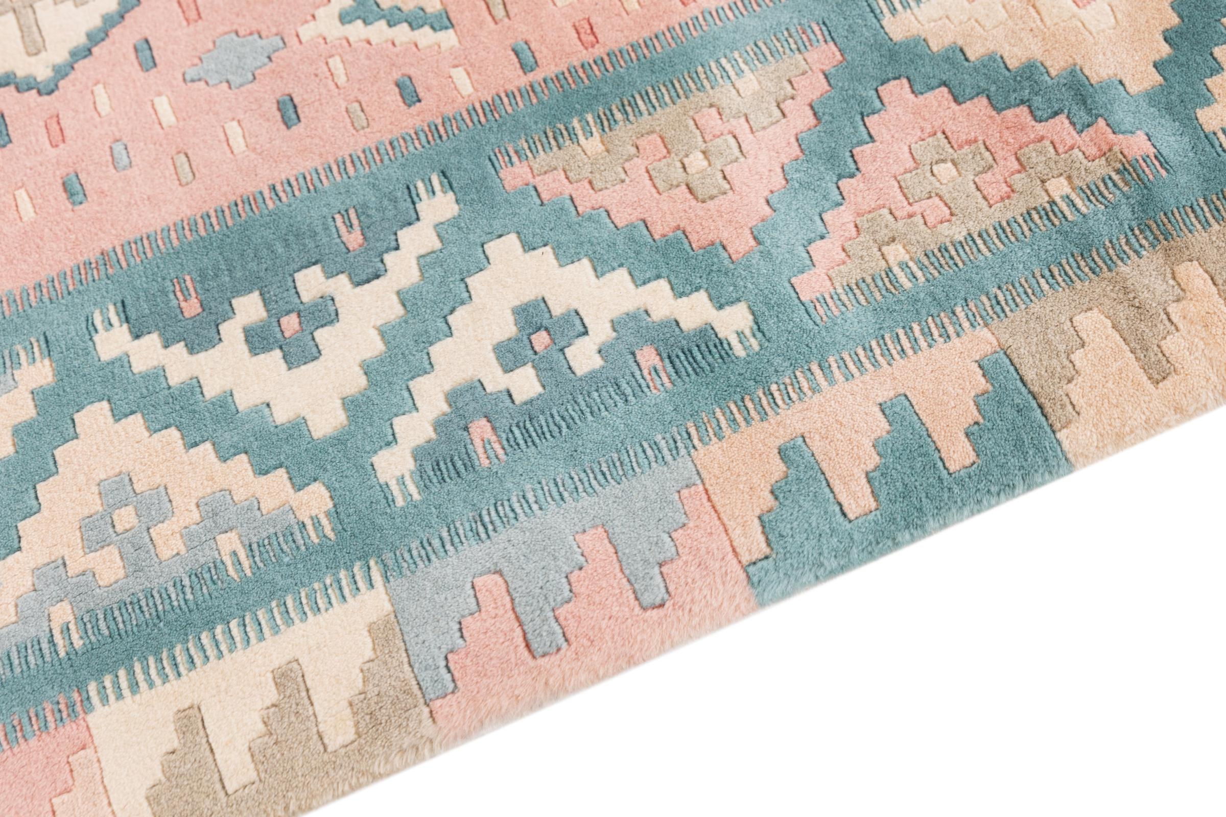 Questo tappeto è stato realizzato a mano su un telaio come una trama piatta. Flatweave è il termine usato per descrivere i tappeti che non hanno pelo. Come promette il nome, questi tappeti sono tessuti e non annodati. Il risultato è un tappeto piatto con una superficie strutturata. Le trame piatte non sono così morbide e di solito più sottili dei tappeti annodati. Allo stesso tempo sono molto meno complessi da produrre e di solito possono essere disposti da entrambi i lati (davanti e dietro). I loro motivi sono di solito geometrici, che è determinato dal tessuto.