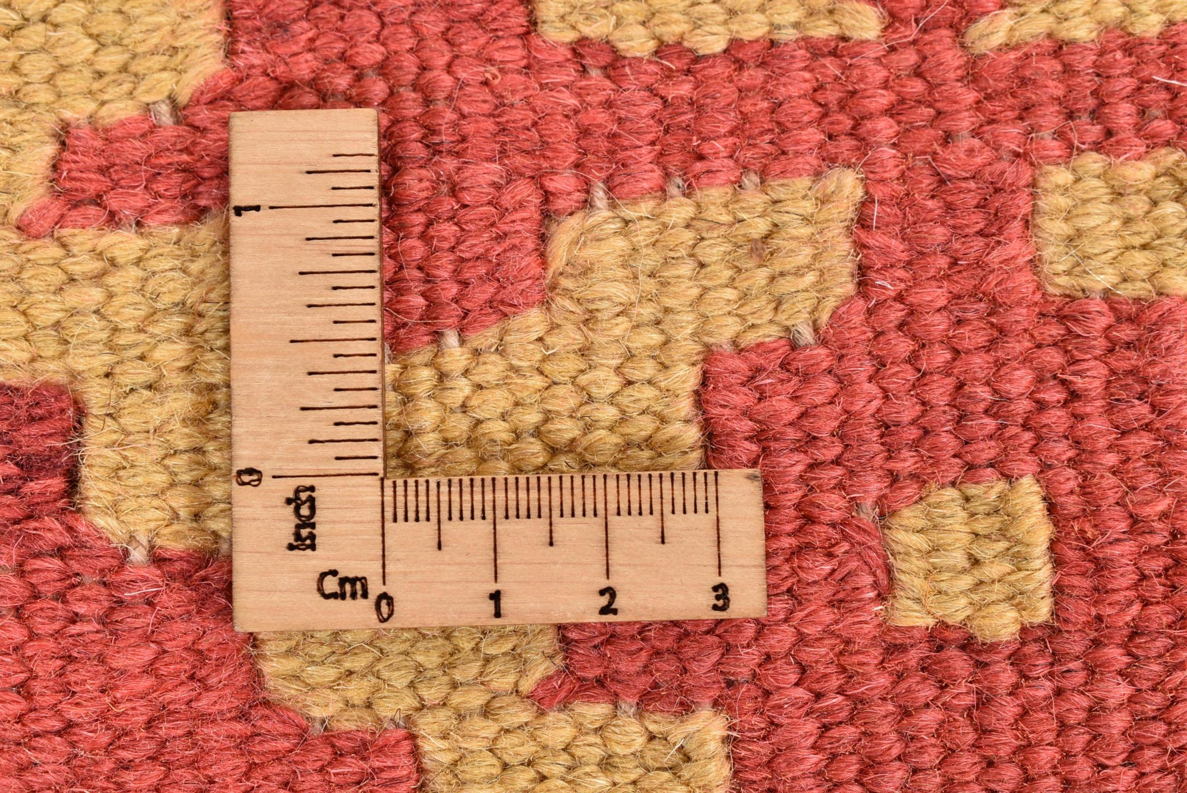 Questo tappeto è stato realizzato a mano su un telaio come una trama piatta. Flatweave è il termine usato per descrivere i tappeti che non hanno pelo. Come promette il nome, questi tappeti sono tessuti e non annodati. Il risultato è un tappeto piatto con una superficie strutturata. Le trame piatte non sono così morbide e di solito più sottili dei tappeti annodati. Allo stesso tempo sono molto meno complessi da produrre e di solito possono essere disposti da entrambi i lati (davanti e dietro). I loro motivi sono di solito geometrici, che è determinato dal tessuto.