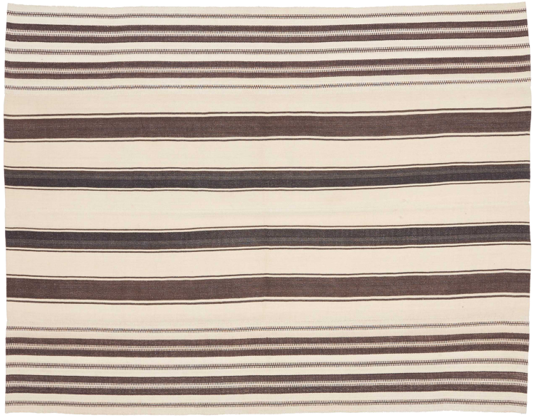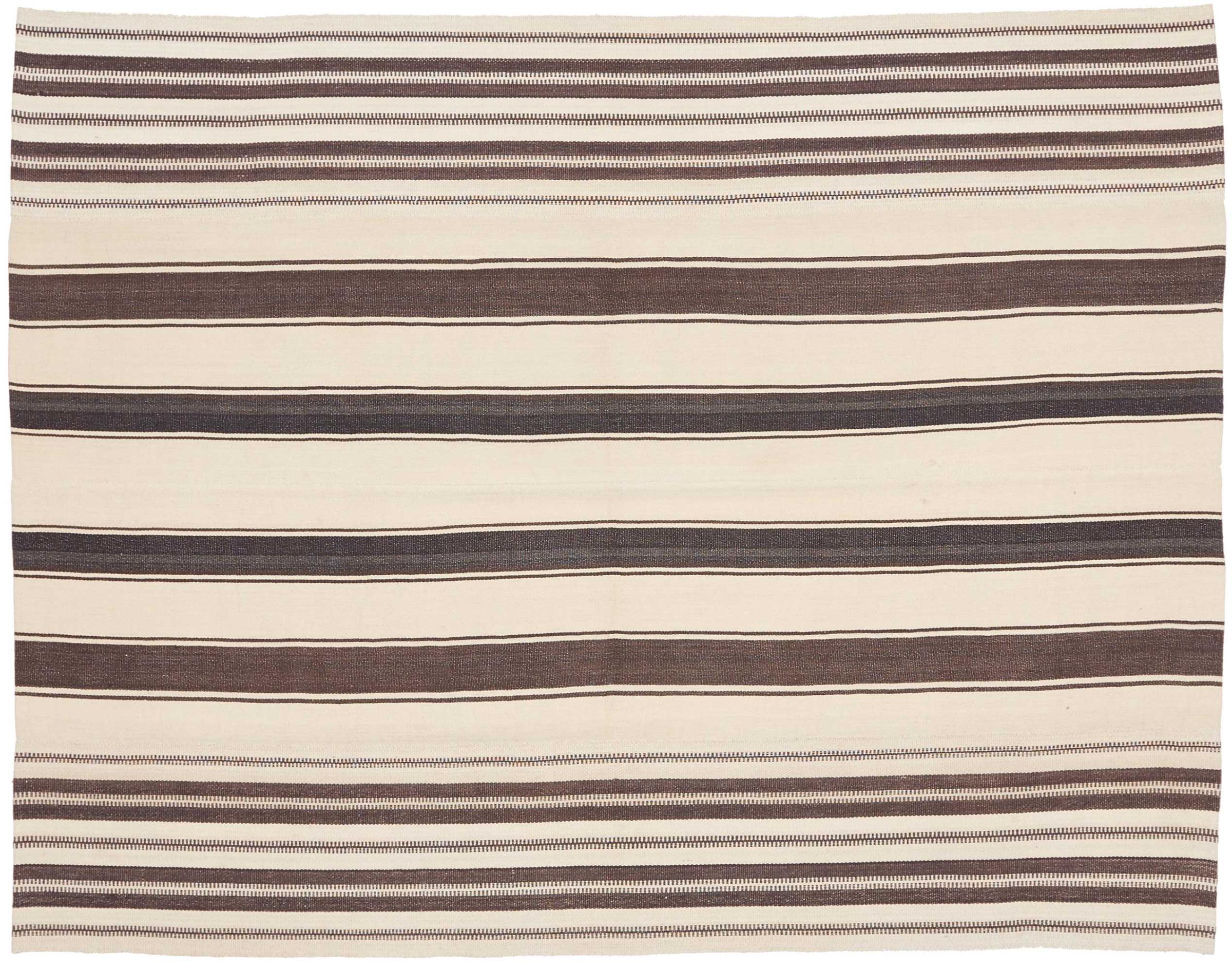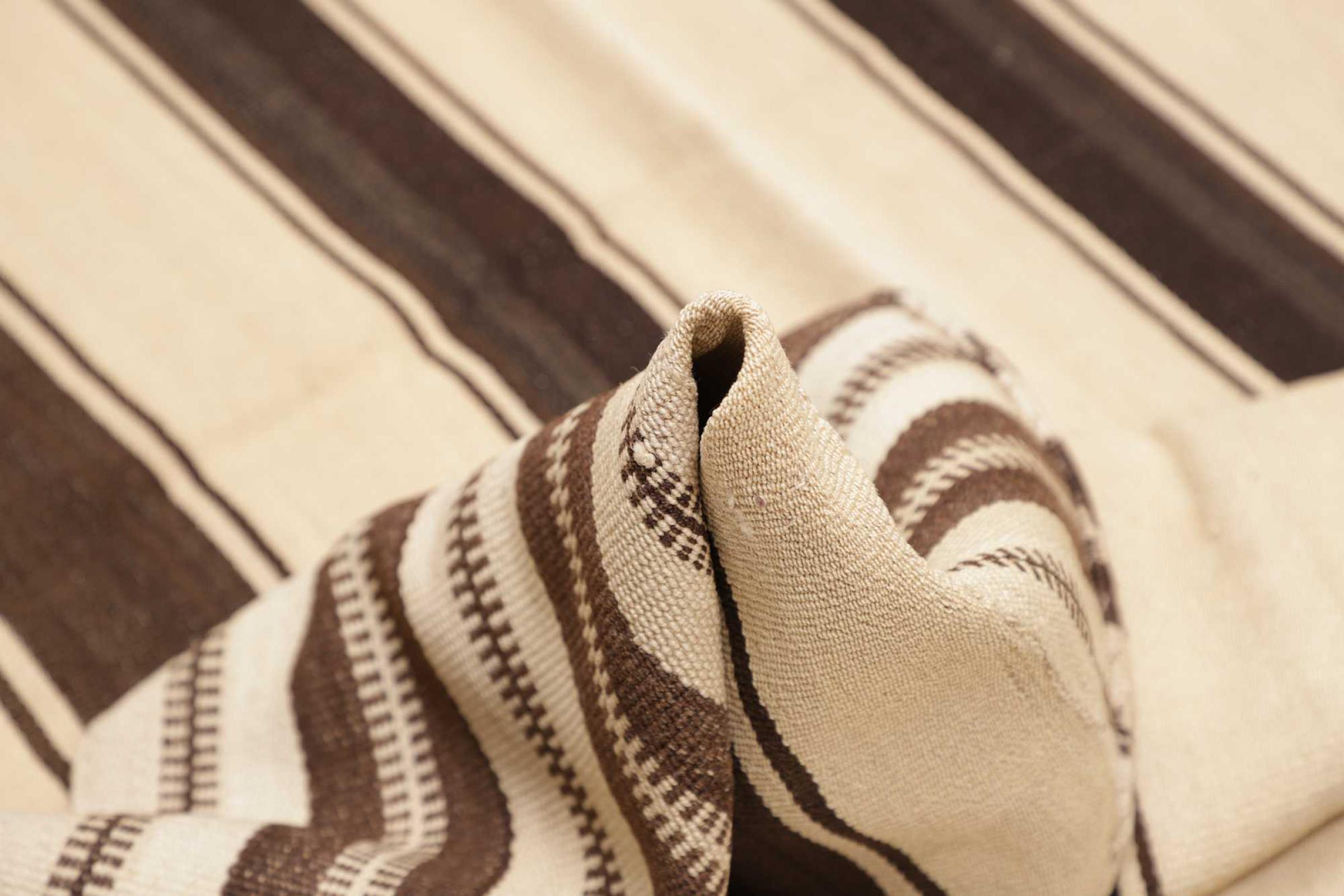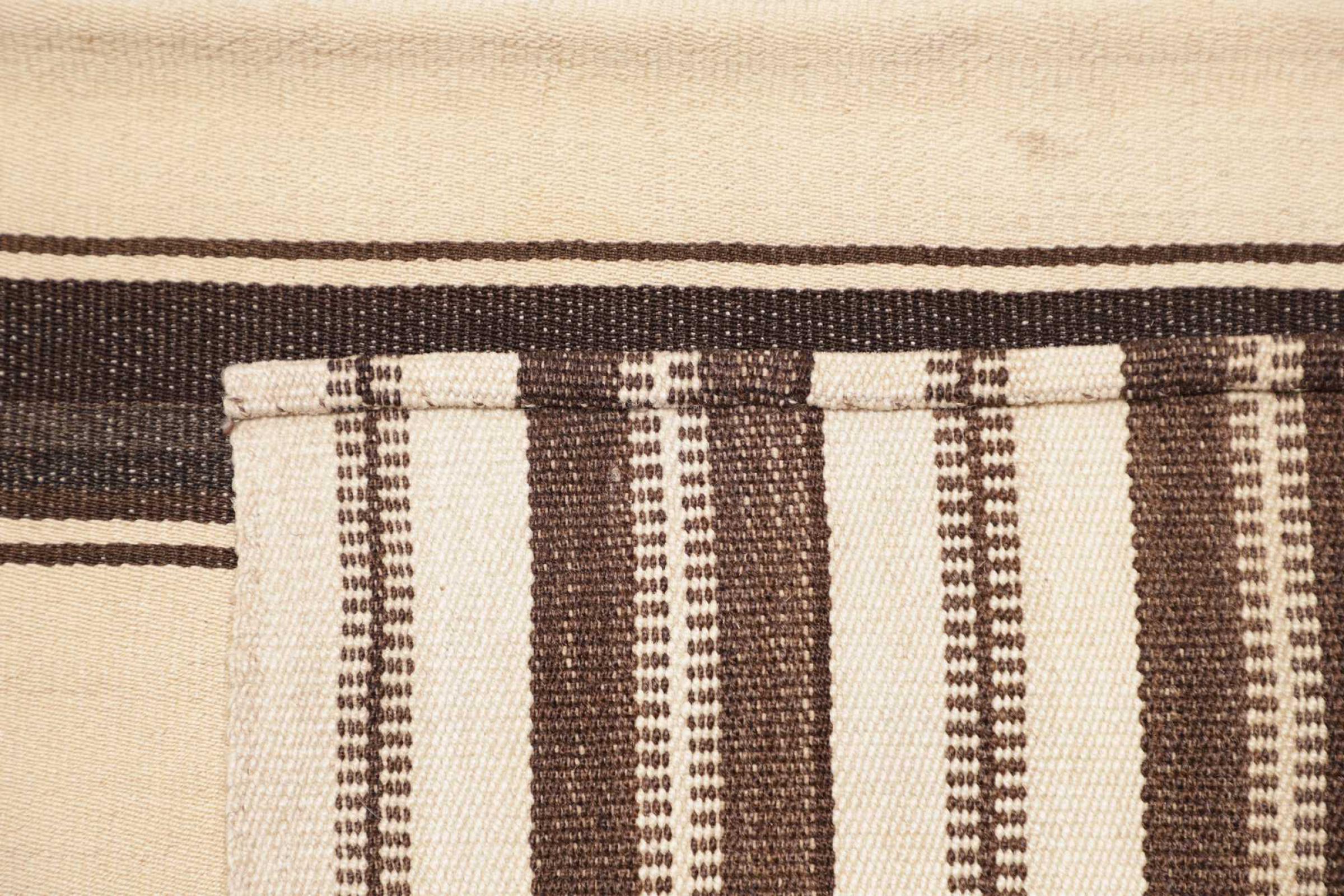 Questo tappeto è stato realizzato a mano su un telaio come una trama piatta. Flatweave è il termine usato per descrivere i tappeti che non hanno pelo. Come promette il nome, questi tappeti sono tessuti e non annodati. Il risultato è un tappeto piatto con una superficie strutturata. Le trame piatte non sono così morbide e di solito più sottili dei tappeti annodati. Allo stesso tempo sono molto meno complessi da produrre e di solito possono essere disposti da entrambi i lati (davanti e dietro). I loro motivi sono di solito geometrici, che è determinato dal tessuto.