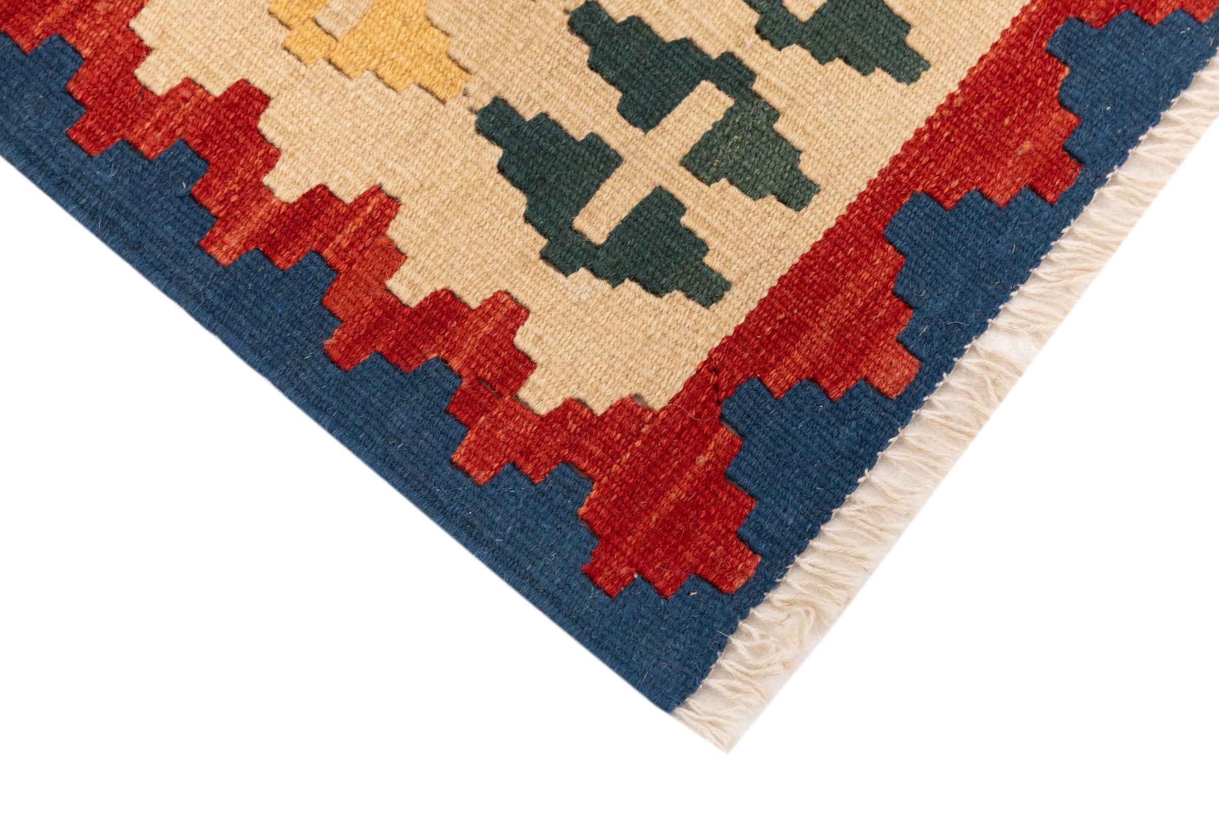 Questo tappeto è stato realizzato a mano su un telaio come una trama piatta. Flatweave è il termine usato per descrivere i tappeti che non hanno pelo. Come promette il nome, questi tappeti sono tessuti e non annodati. Il risultato è un tappeto piatto con una superficie strutturata. Le trame piatte non sono così morbide e di solito più sottili dei tappeti annodati. Allo stesso tempo sono molto meno complessi da produrre e di solito possono essere disposti da entrambi i lati (davanti e dietro). I loro motivi sono di solito geometrici, che è determinato dal tessuto.